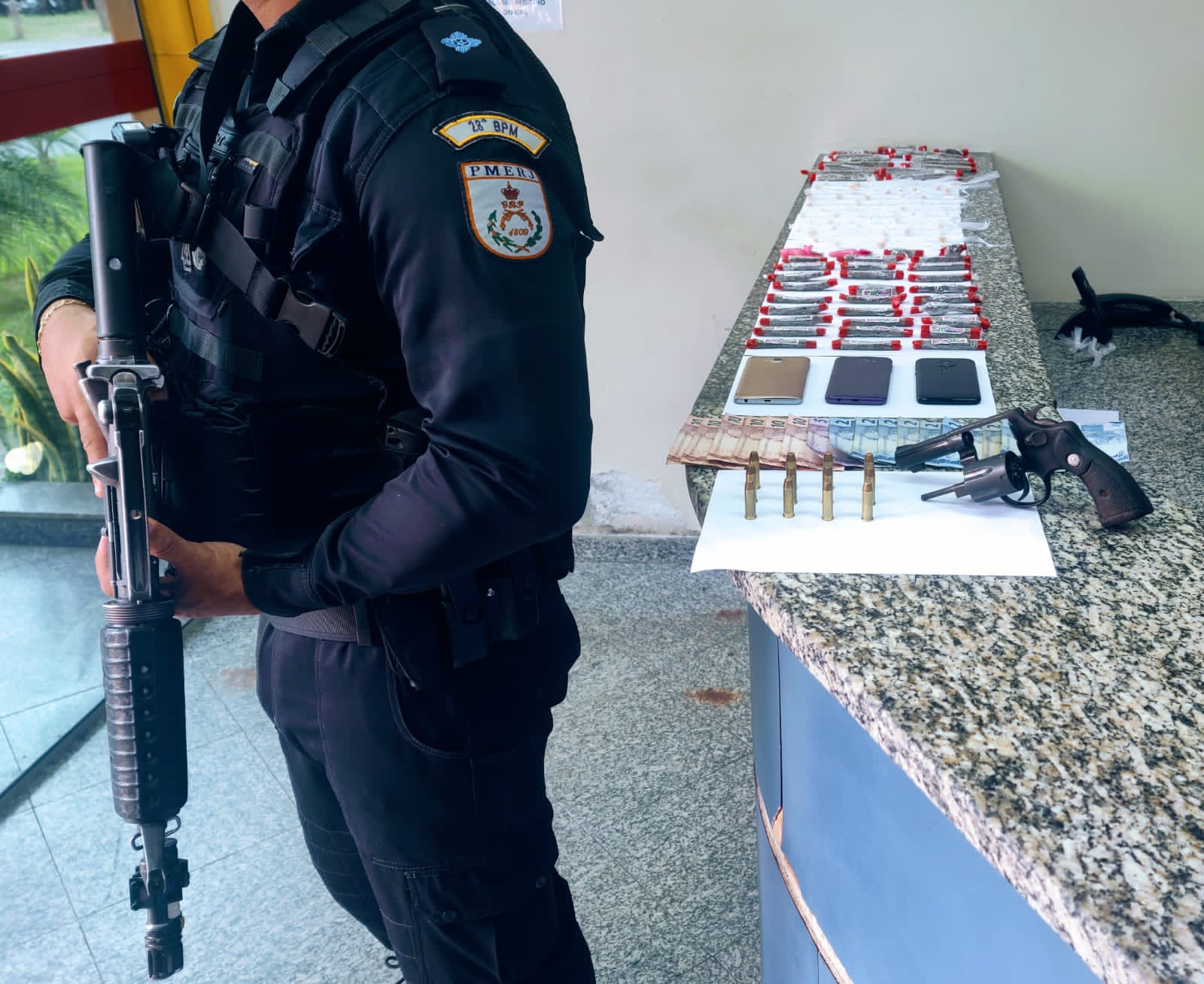 Na operação, foram apreendidos 45 trouxinhas de maconha, 47 pedras de crack e dois pinos de cocaína. E ainda: um revólver calibre 38 com 12 munições, além de sete celulares.