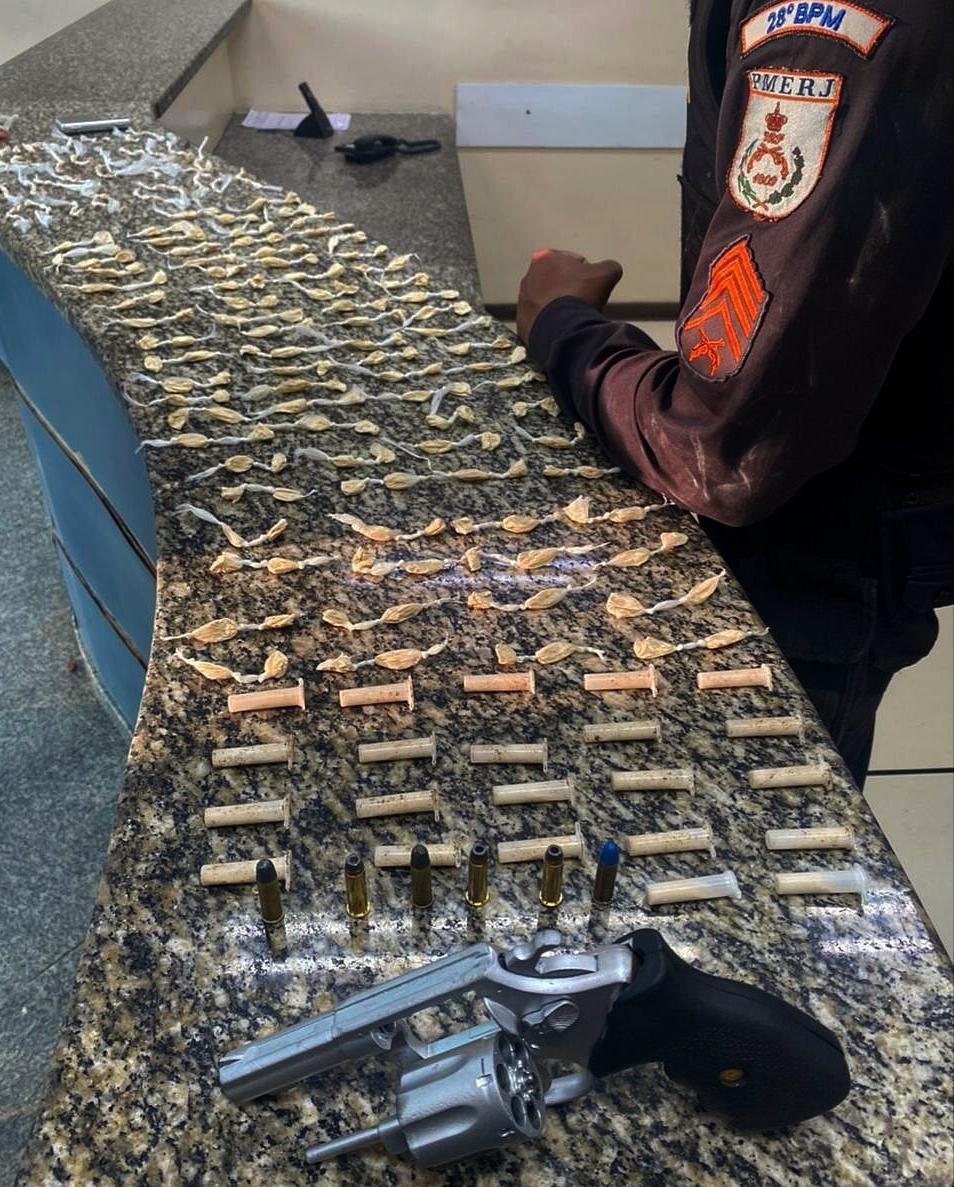 Com o capturado, foi encontrado um revólver 38 e pinos de cocaína. Em varredura no terreno, foram encontrados 156 pinos de cocaína, 145 pedras de crack e 22 pinos de cocaína, além da balança digital.
