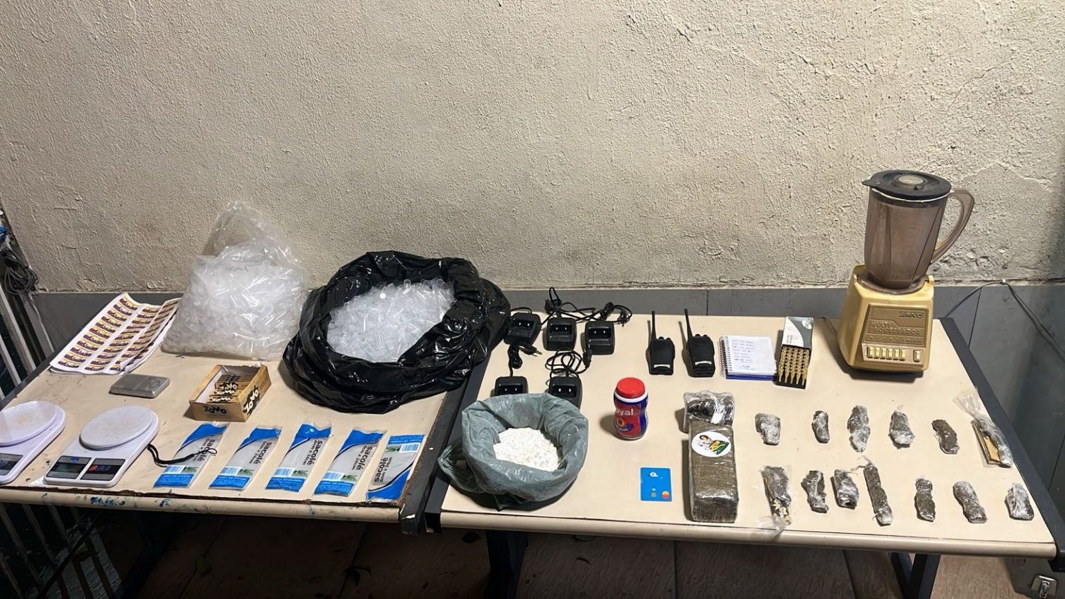 Segundo a polícia, um prova que o local servia para o preparo de drogas foram apreendidos três balanças digitais, 10 embalagens de seda, um liquidificador, dois rádios de comunicação, cinco base do aparelho e um caderno de anotação do tráfico. Todo o material foi levado para a delegacia de Volta Redonda (93º DP).