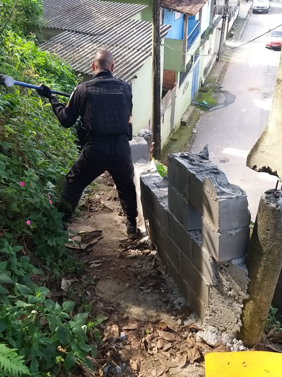 A polícia militar já derrubou um muro de contenção feito pelos traficantes.