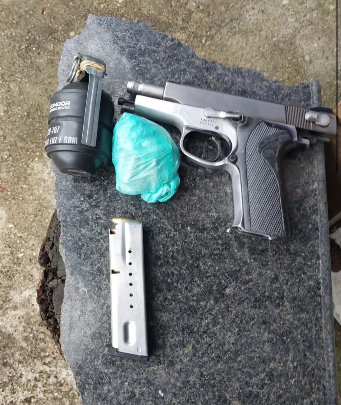 Ao chegar no local, os agentes encontraram uma pistola de calibre 9 milímetros, 35 munições e uma granada.