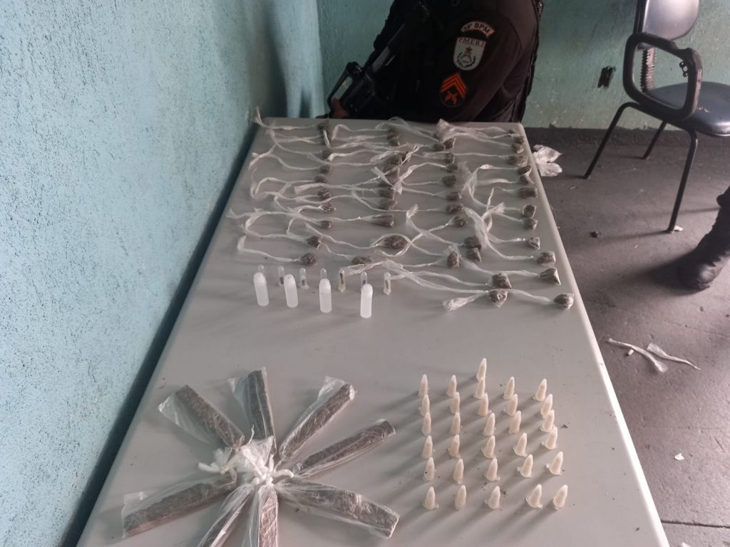 O suspeito estava com oito tabletes de maconha, 50 sacolés da mesma droga, sete pinos de skunk, 31 pinos de cocaína e quatro frascos de loló.