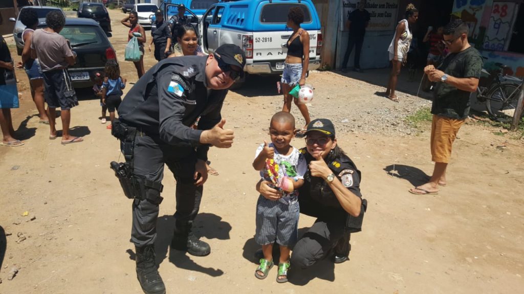 Os agentes do estado foram recebidos com sorrisos de crianças. Em resposta, os policiais deram abraços e, claro, também brinquedos. Afinal, hoje é o dia dos pequenos.