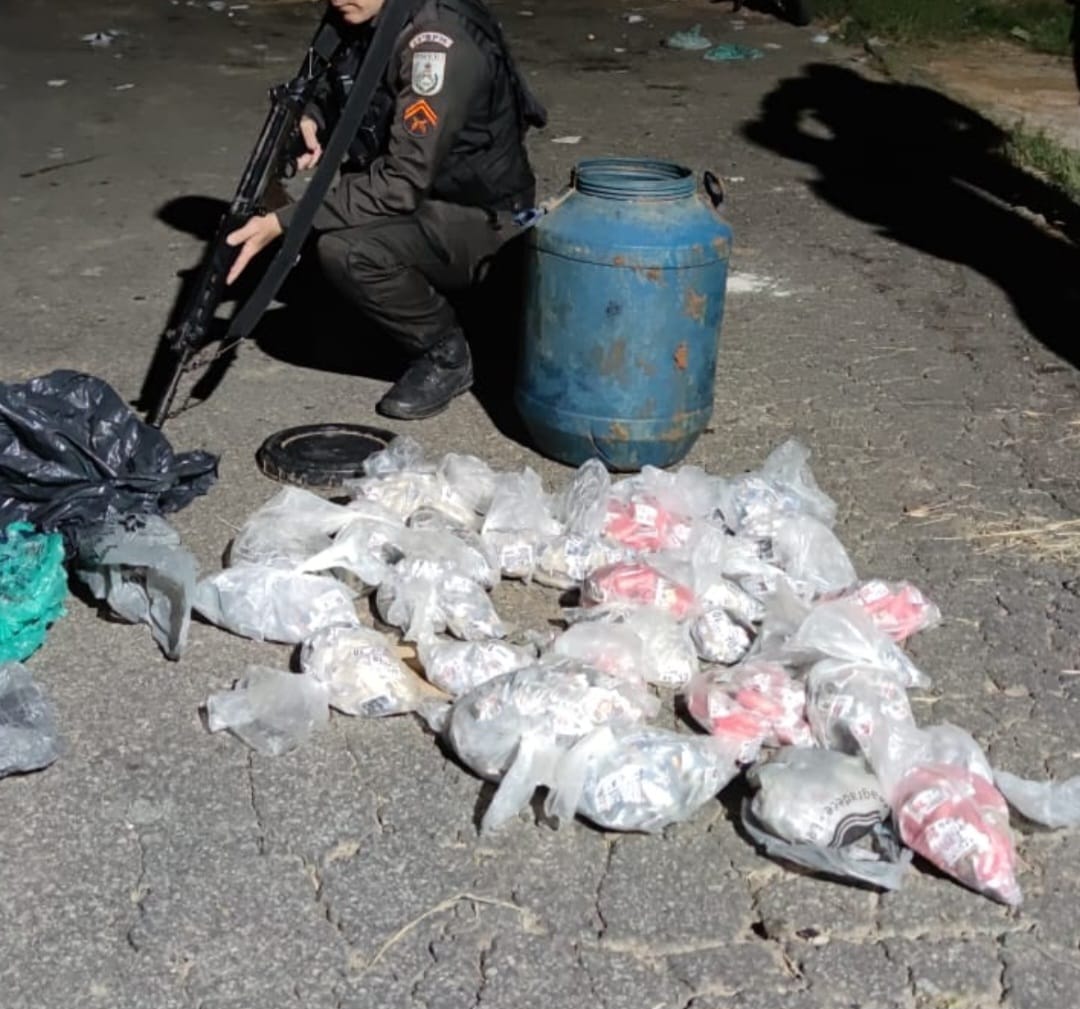 Em busca pelo terreno, foram encontrados dentro de um barril 810 pinos de cocaína, 3.264 trouxinhas de maconha e 1.420 pedras de crack. Pelos preços nas etiquetas, com a venda, o tráfico teria um rendimento de R$ 20 mil. As drogas foram levadas para a delegacia da cidade (88º DP), onde o caso foi registrado.
