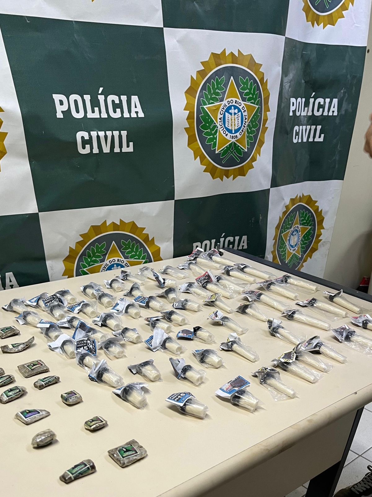 Um dos familiares autorizou a entrada dos policiais na residência. No guarda roupa, foram encontrados 63 pinos de cocaína e 11 tabletes de maconha com a marca da facção Comando Vermelho. Os materiais foram levados para a delegacia, onde o caso foi registrado.