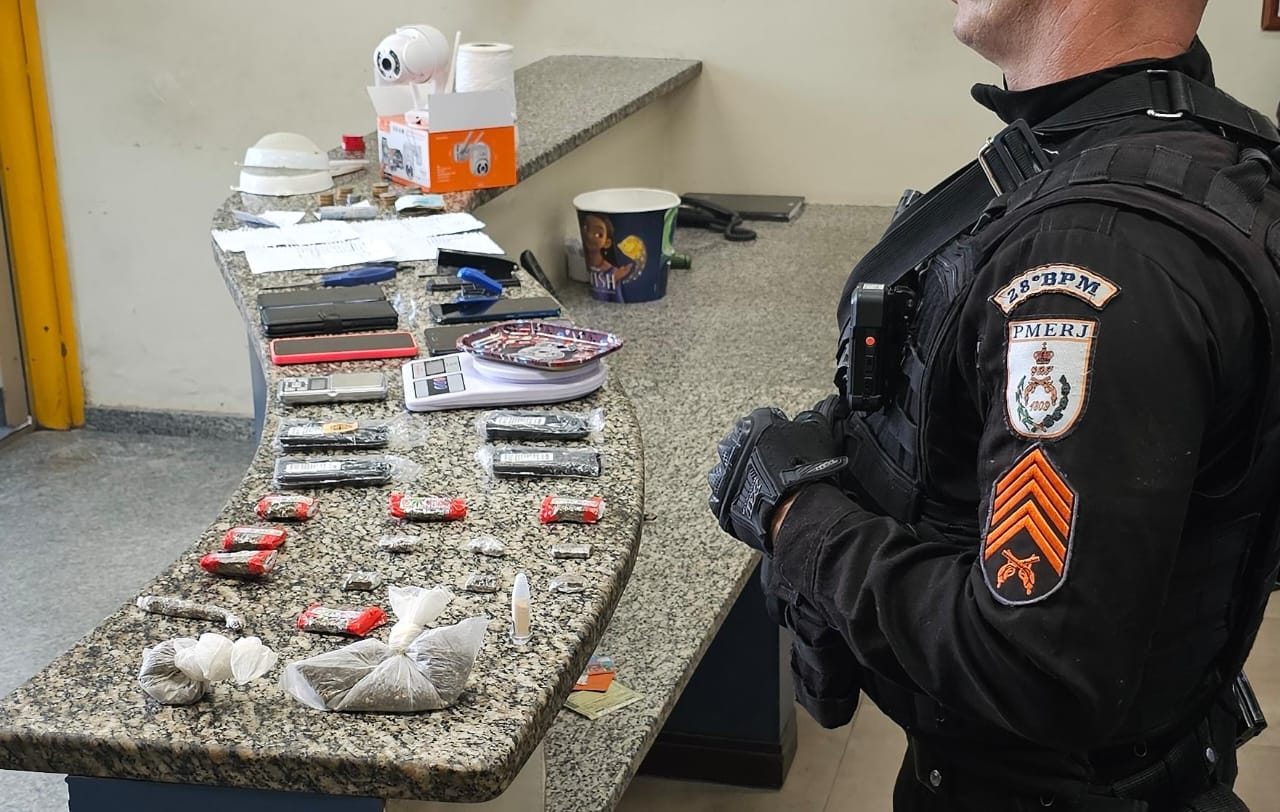 Foram apreendidos: foram apreendidos 15 trouxinhas de maconha, três pinos de cocaína e materiais do tráfico como, por exemplo, duas balanças, uma bandeja, três tesouras, dois grampeadores, duas peneiras, quatro celulares, um tablet, folhas de anotação do trafico, R$ 435 em dinheiro e câmera de monitoramento.
