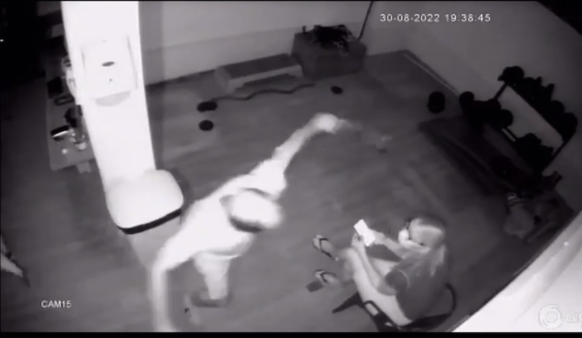 A agressão acontece dentro da academia de um dos blocos do condomínio de luxo. No registro, é possível ver que a vítima chega a ser arremessada no chão com a força do golpe desferido pelo agressor. Ela mexia no celular, sentada em uma cadeira, quando foi atingida pelo tapa.