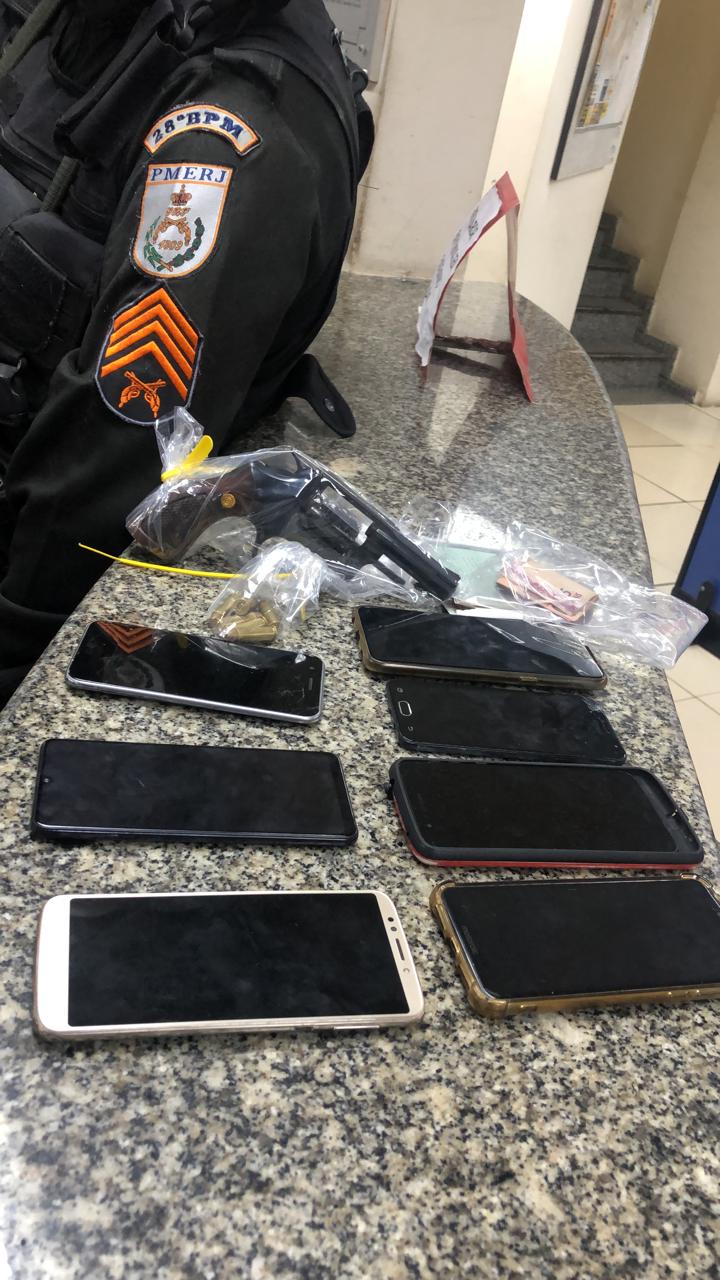 Após uma busca, os agentes identificaram o veículo e ao abordar encontraram sete aparelhos celulares e um revólver calibre 38, durante a revista no interior do carro.