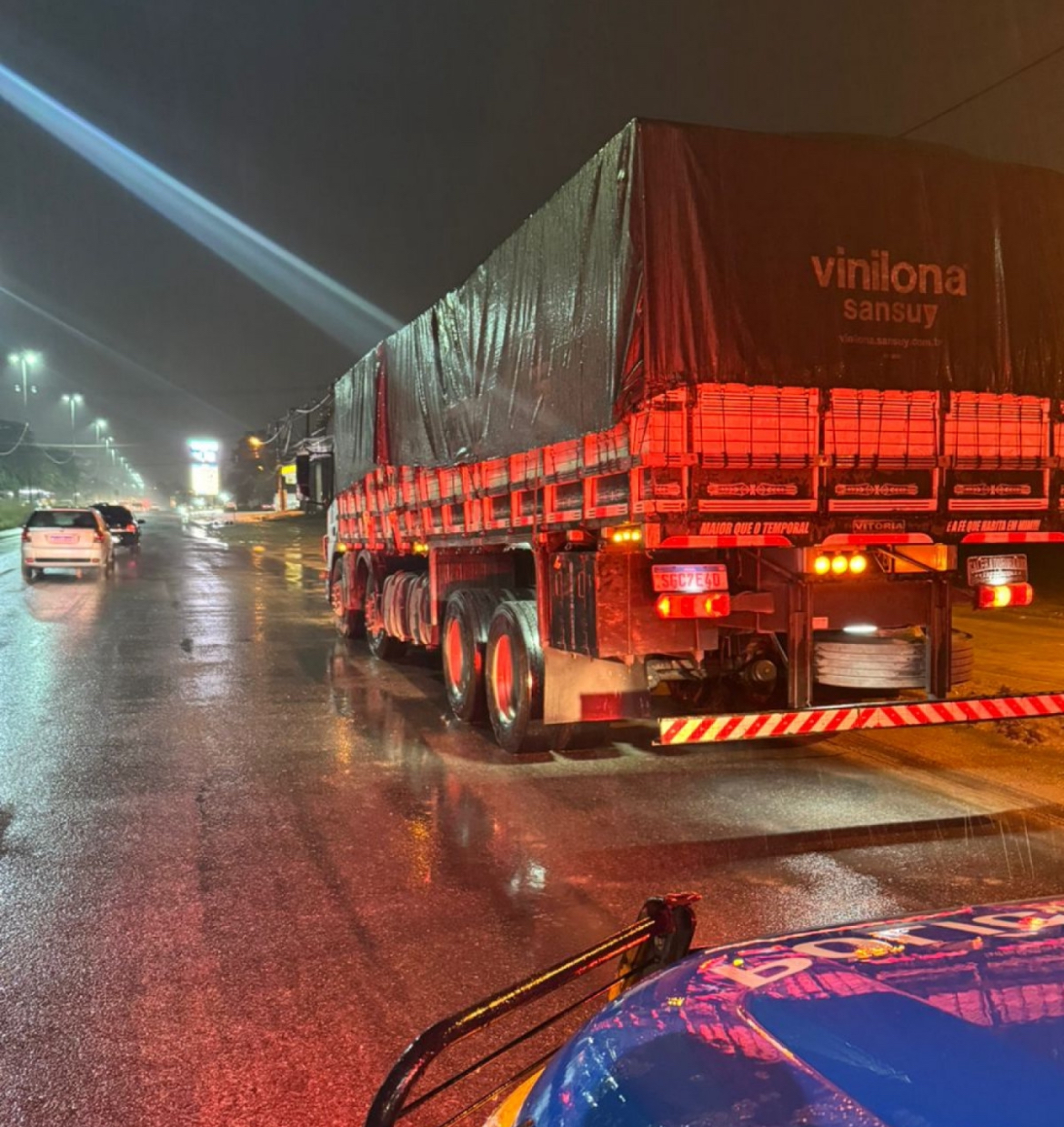 De acordo com a Polícia Militar, agentes do 35° BPM (Itaboraí) foram acionados e localizaram o veículo na RJ-104, nas proximidades do bairro Marambaia. Eles interceptaram o caminhão e um homem foi detido. Com ele, a polícia apreendeu um bloqueador de sinal GPS, utilizado para dificultar o rastreamento do veículo.