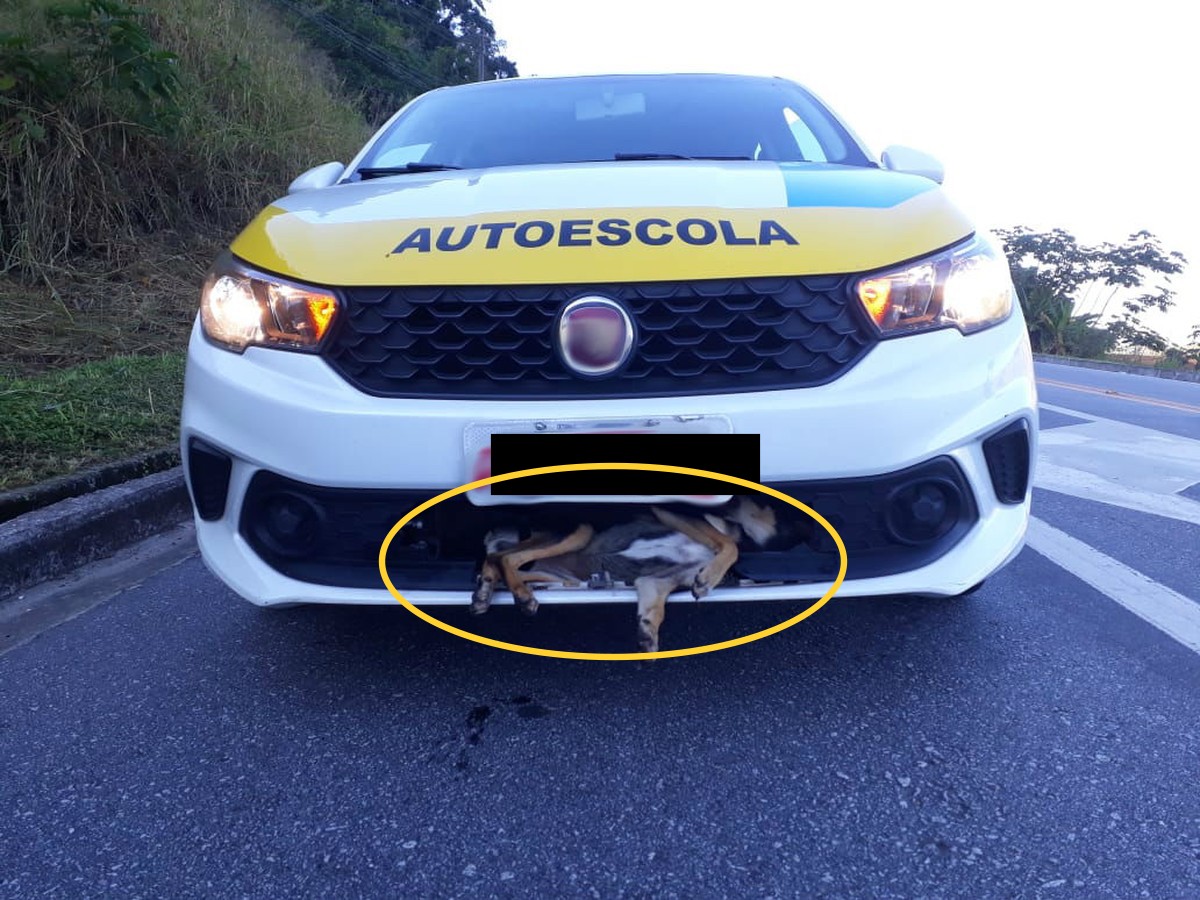 Depois de andar por aproximadamente 20 metros o condutor do veículo — que é instrutor de autoescola — encontrou o cachorro preso ao carro.
