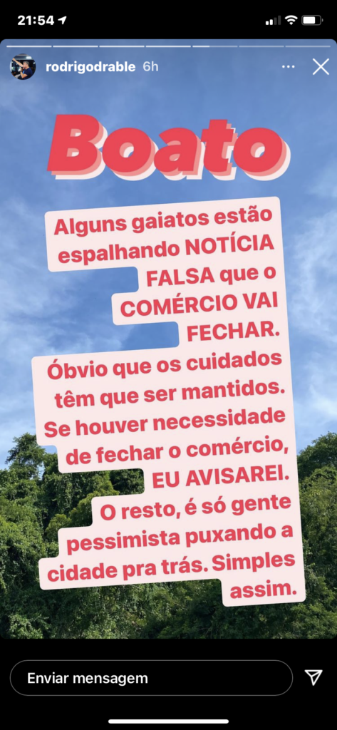 Nas redes sociais, o prefeito Rodrigo Drable (Barra Mansa) desmentiu neste domingo (24) o boato que a comércio fechará nos próximos dias. “Alguns gaiatos estão espalhando notícia falsas que o comércio vai fechar. Óbvio que os cuidados têm que ser mantidos”, diz o prefeito, que continuou: