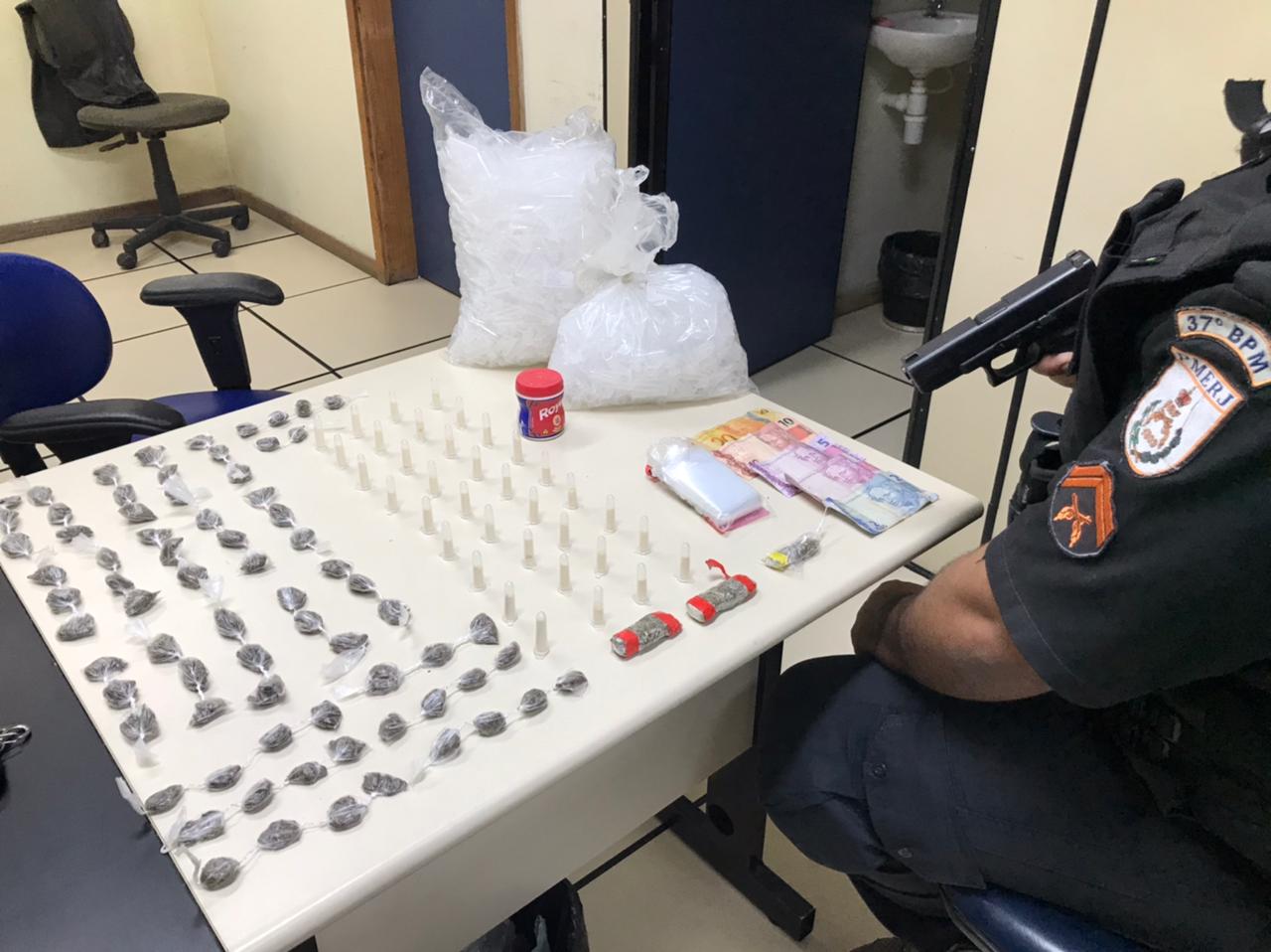 Um jovem, de 23 anos, foi preso, e um menor, de 17, apreendido, por suspeita de tráfico de drogas em Porto Real. Policiais do 37º Batalhão da PM abordaram a dupla, na quarta-feira, dia 11, quando estavam pulando de um Ciep na Avenida das Industrias, no bairro Freitas Soares.