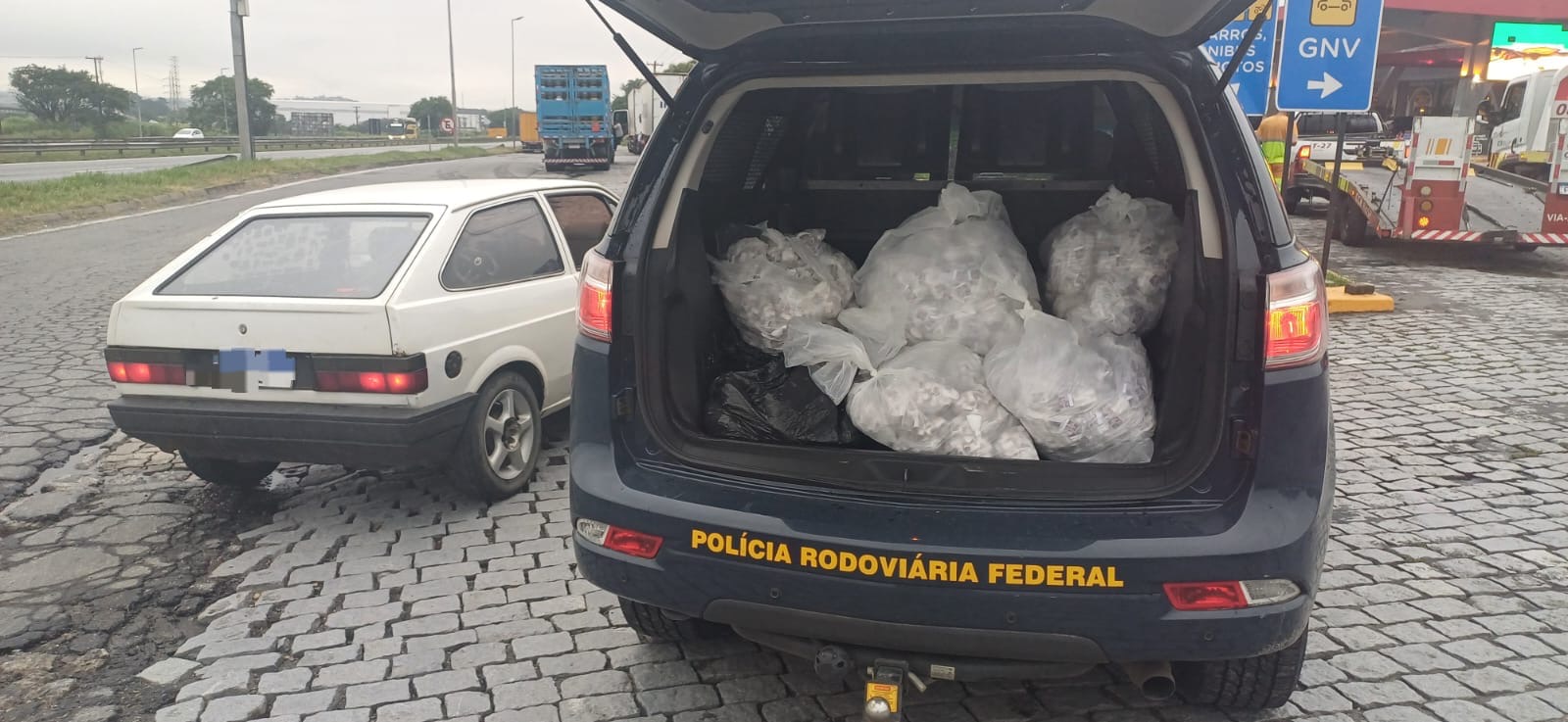 Ao retornar ao veículo, agora já parado no posto de combustíveis, a equipe encontrou no porta malas e no banco traseiro grande quantidade de substância análoga a material entorpecente (cocaína e maconha), já fracionada para a venda final.