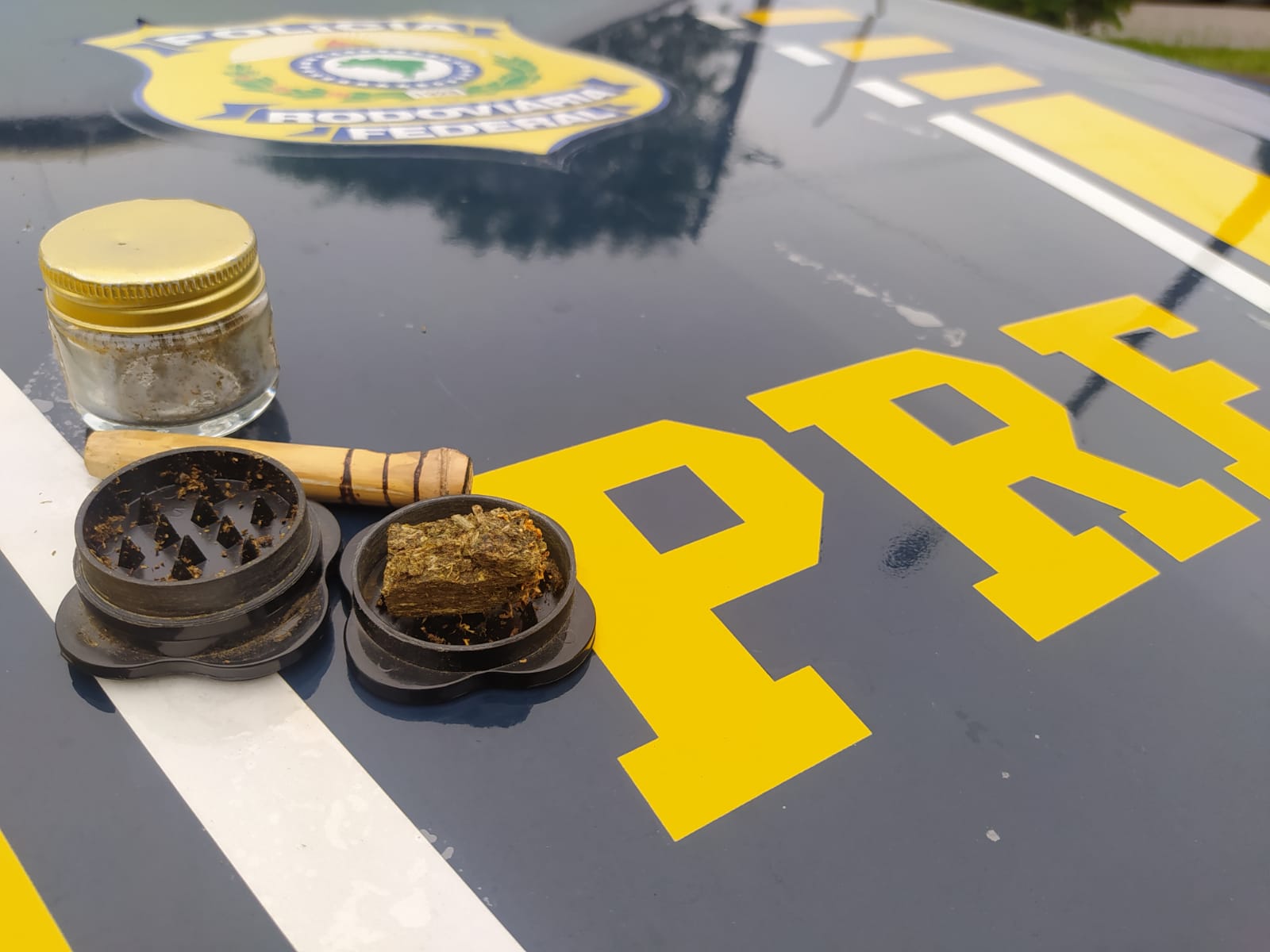 Ao ser questionado, o homem logo disse que era usuário de maconha e entregou uma pequena quantidade da erva. A droga estava no porta luva do veículo.