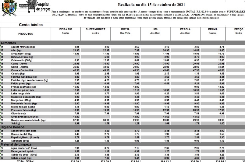 A menor cotação, de acordo com a pesquisa, ficou com um supermercado localizado no bairro Boa Vista, no valor de R$ 322,94. A maior com um estabelecimento próximo à subida do Verbo Divino, com custo de R$ 371,29. A diferença entre os dois estabelecimentos ficou em R$ 48,35 e o preço médio da cesta em R$ 339,43.