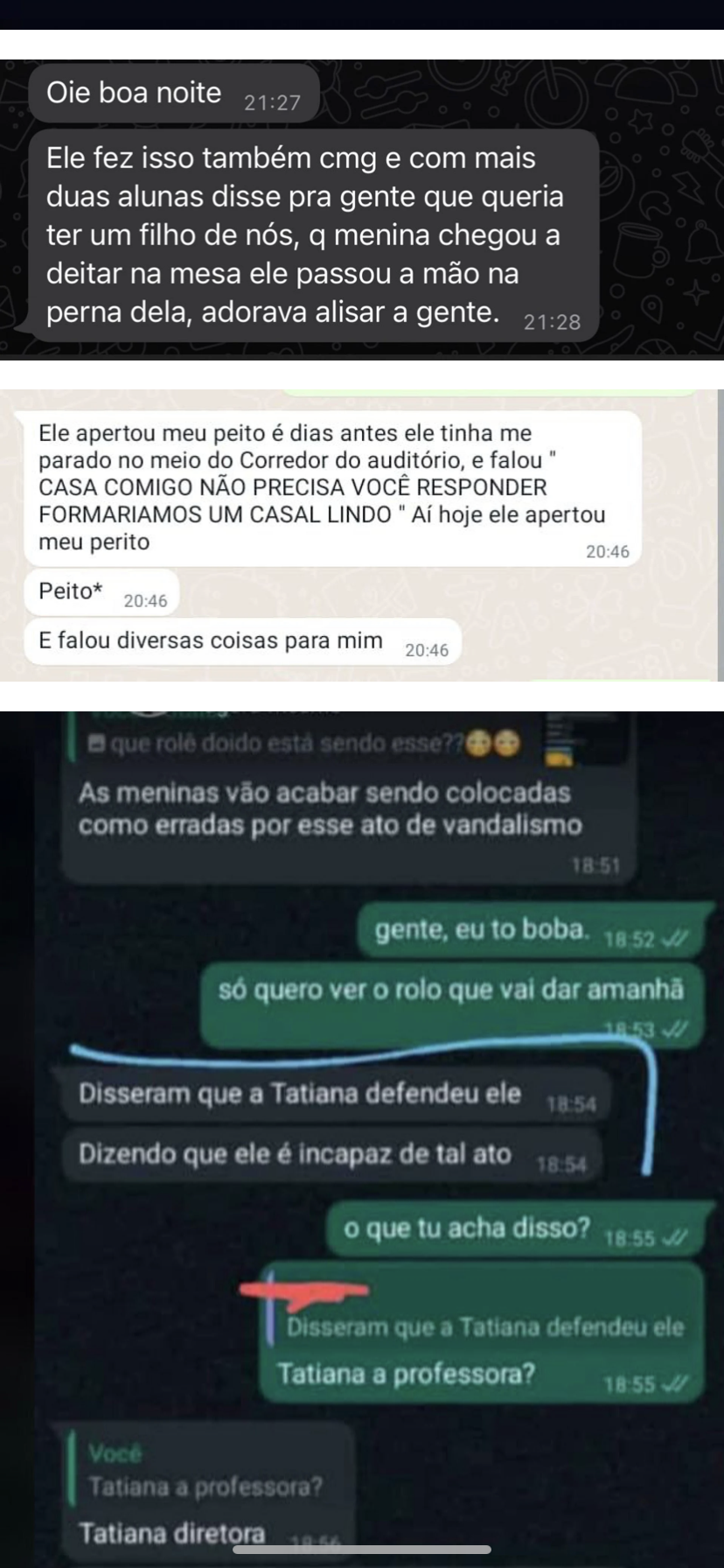 Na última segunda-feira (11), uma aluna, de 14 anos, teria chegado em casa chorando após a aula, relatando ter sofrido assédio sexual cometido pelo professor. “Eu saí pra pegar uma caneta, ele me cercou no corredor e falou que eu era muito bonita, que era um casal bonito (sic), e ficou mordendo a boca. Ontem era aula dele, a gente começou a cantar, do nada parou na minha mesa e passou a mão no meu peito. Ai os meninos começaram a gritar”, disse a estudante.