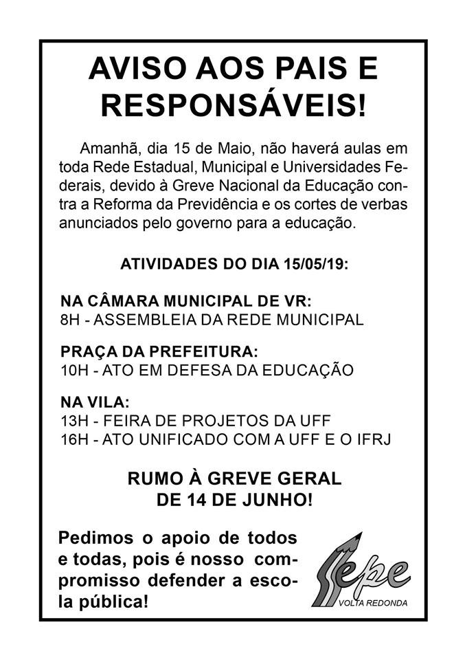 O Sepe (Sindicato Estadual de Profissionais de Educação) de Volta Redonda emitiu uma nota informando aos pais de estudantes que nesta quarta-feira (15) não haverá aula nas redes municipal e estadual.