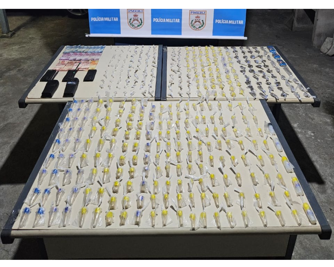 Segundo o balanço, foram arrecadado, 94 embalagens contendo crack, 50 com maconha, 245 com cocaína e cinco frascos de loló. Também foram apreendidos dois rádios de comunicação e três baterias, além de R$ 82 em espécie. O material estava numa sacola e numa mochila