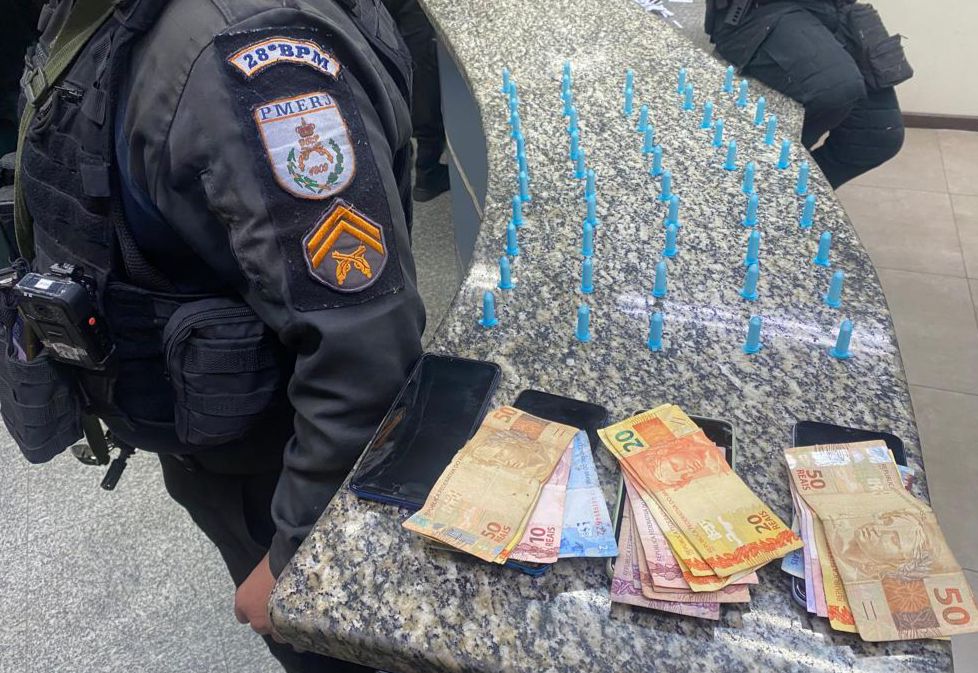 Chegando, com o cerco policial, os agentes conseguiram deter os quatro. Com eles, foram apreendidos 50 pinos de cocaína e R$ 409 em espécies. Além de tráfico, o rapaz de 22 anos tinha um mandado de prisão em aberto por homicídio expedido pela justiça.