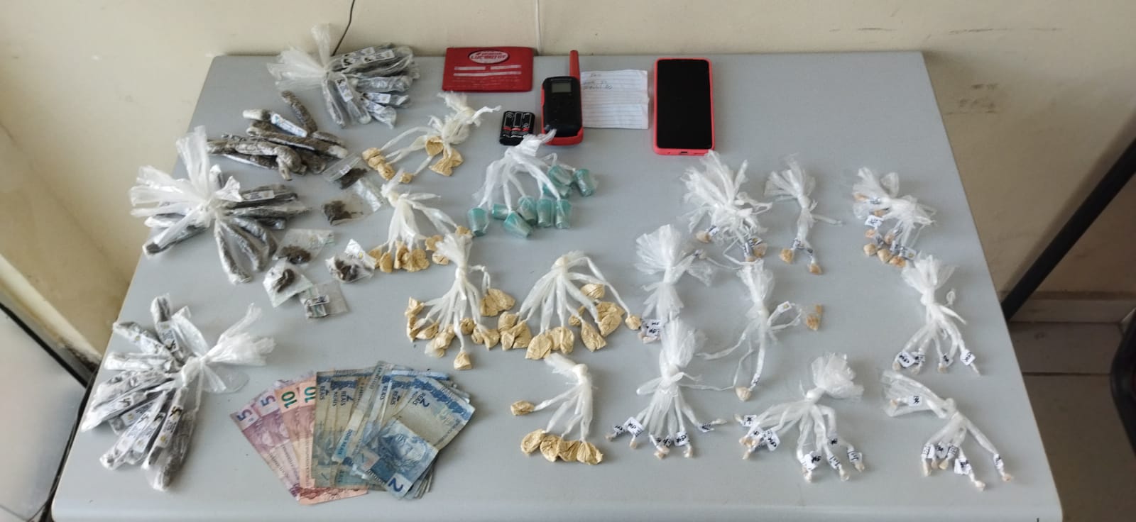 Chegando, os policiais fizeram o cerco e a abordagem aos suspeitos. Com eles, foram apreendidos 54 pinos de cocaína, 49 pedaços de maconha, 40 pedras de crack, além de um rádio de comunicação e uma folha da contabilidade da venda de drogas, além de R$ 64 em espécies.