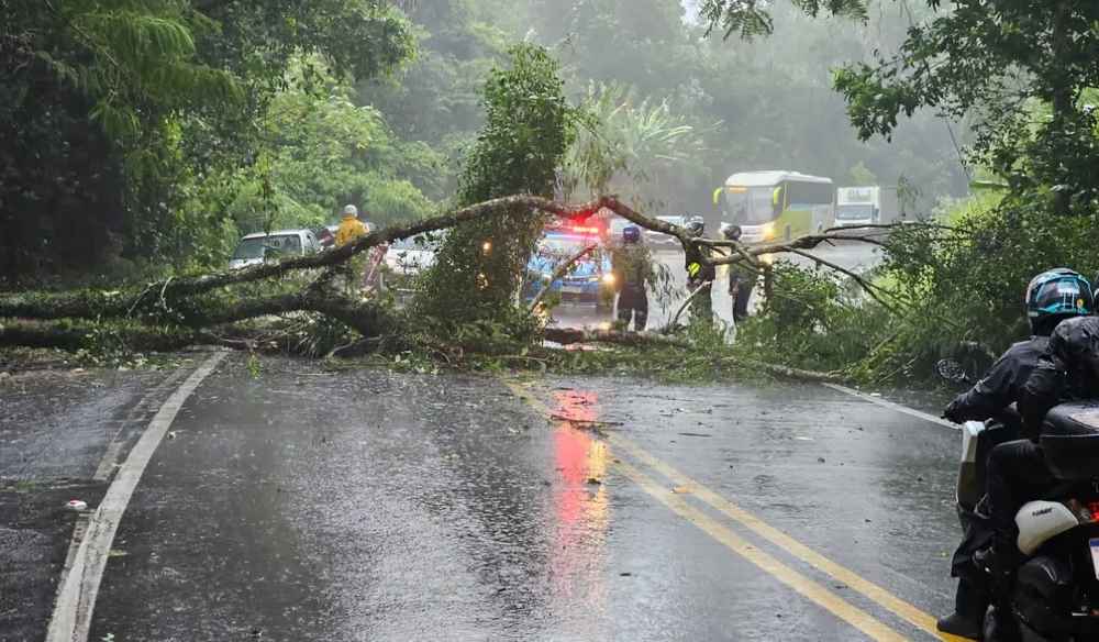 Uma árvore caiu sobre a BR-101 (Rodovia Rio-Santos) e interditou o trânsito nos dois sentidos da estrada nesta terça-feira (23). O incidente aconteceu no km 457, na altura do bairro Portogalo.