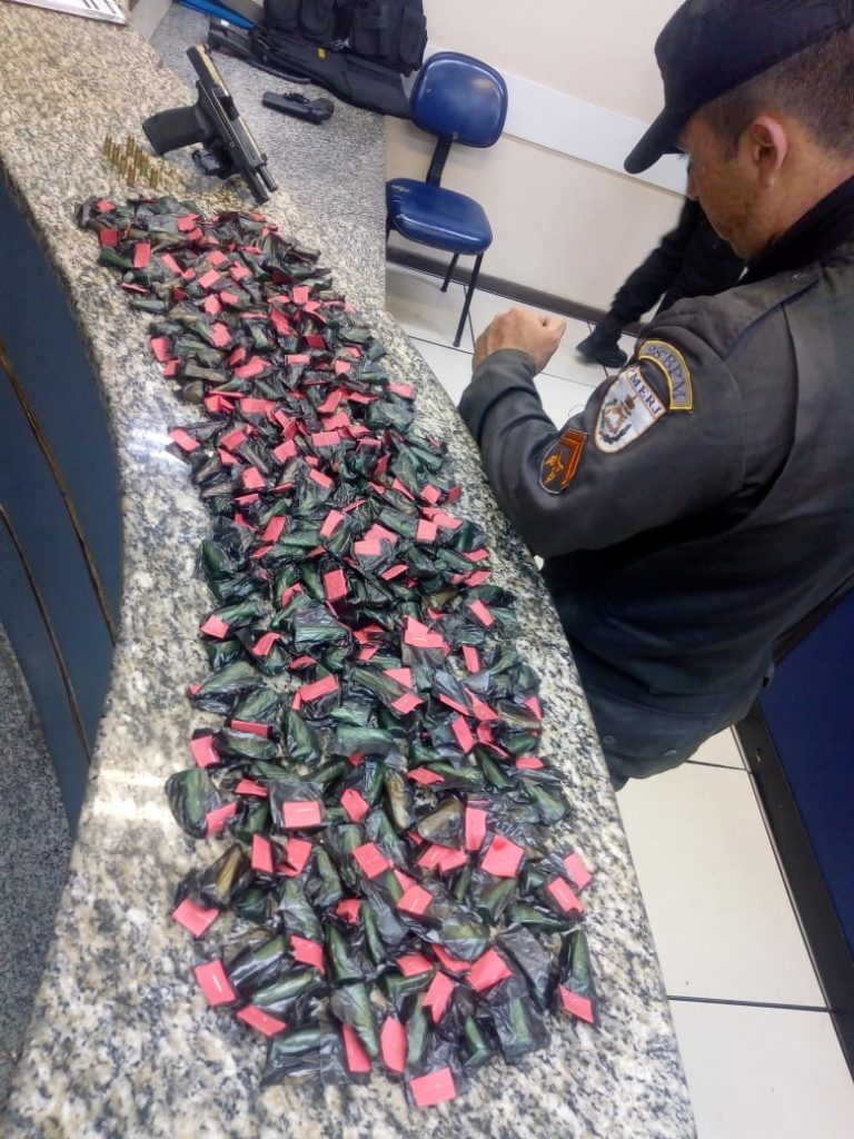 Foram encontrados na área de mata os seguintes materiais: 225 pinos de cocaína, uma pistola com a numeração raspada, um carregador e munições.