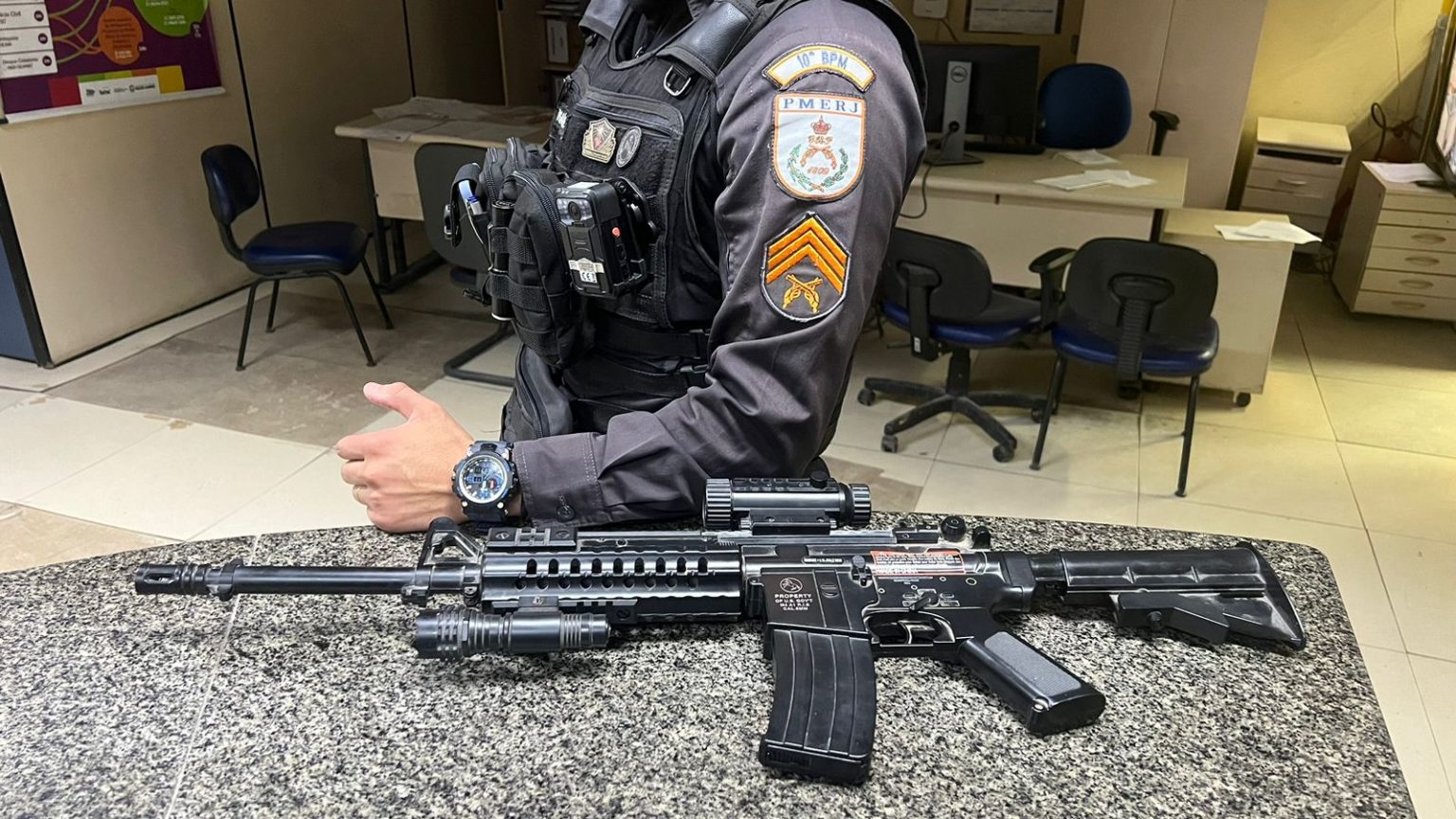 Uma réplica de fuzil foi apreendida na noite desta terça-feira (29) com um jovem de 19 anos. Ele é suspeito de exibir – inibindo os moradores – o simulacro nas ruas do distrito de Barão de Juparanã, em Valença. Porém, ele foi abordado na estrada RJ-155 (Saturnino Braga), que liga Barra Mansa à Angra dos Reis.