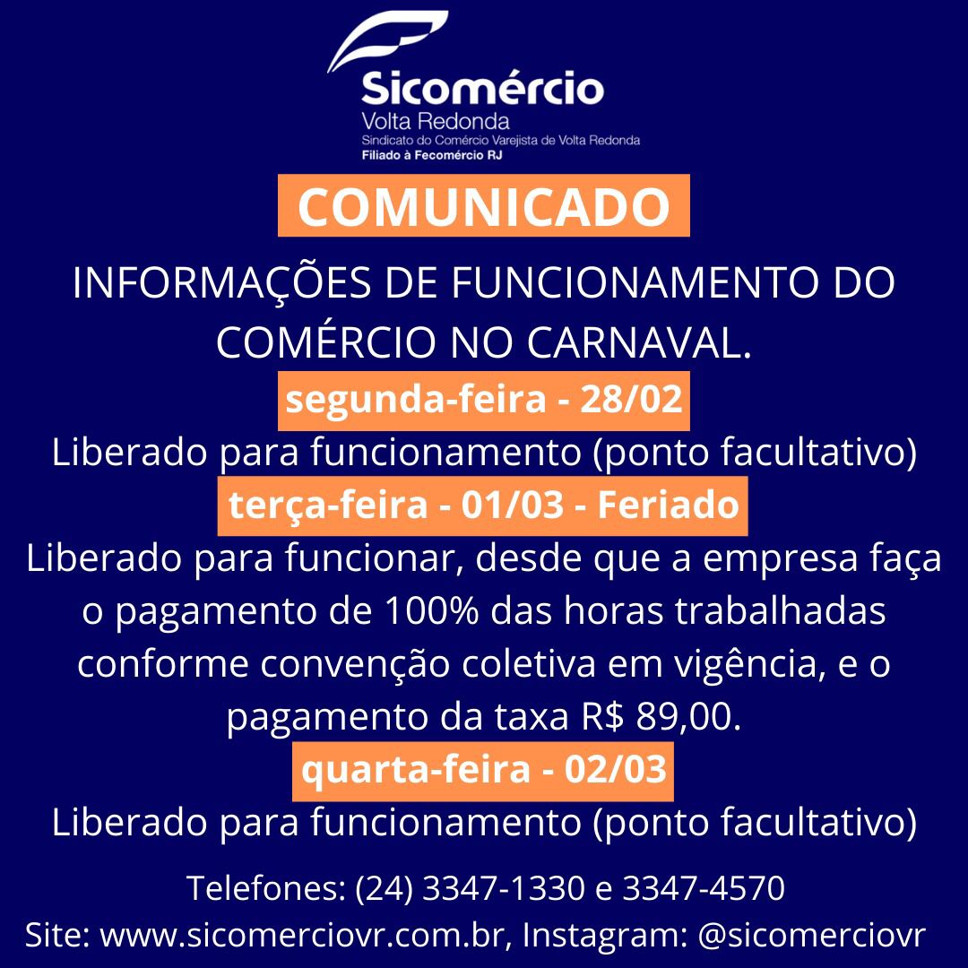 O Sindicato do Comércio de Volta Redonda (Sicomércio-VR) informou que o horário de funcionamento dos estabelecimentos comerciais será facultativo de segunda-feira (28) a quarta-feira (02/03).