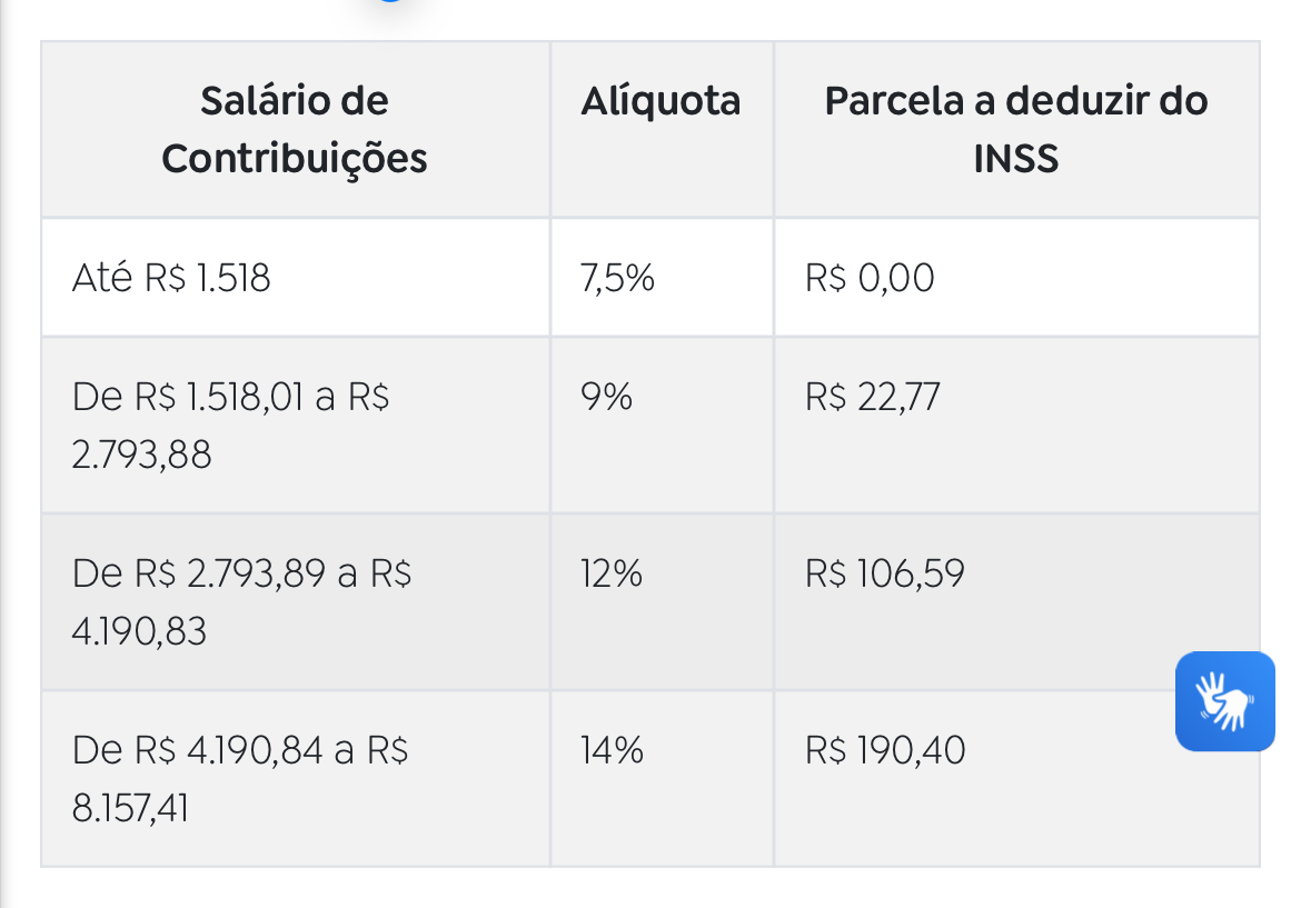A correção de 4,77% também incidirá sobre a tabela do INSS, por meio da qual os trabalhadores da iniciativa privada com carteira assinada e de empresas estatais recolhem as contribuições mensais à Previdência Social. As alíquotas e as faixas de dedução vão incidir sobre as seguintes faixas: