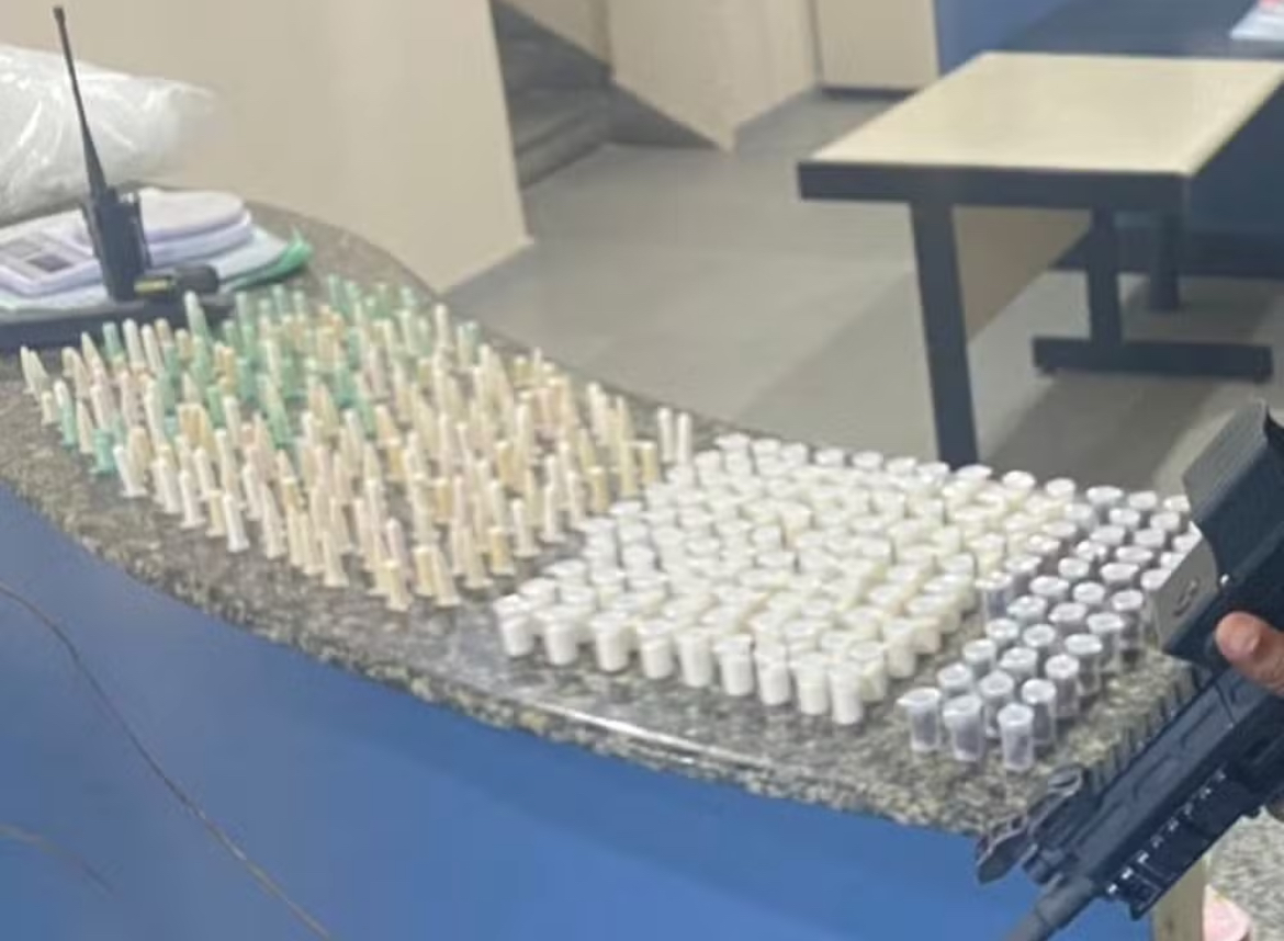 Após cessarem os tiros, foram encontrados drogas, dois carregadores de pistola, quatro munições de calibre nove milímetros, um rádio de comunicação e material para embalar entorpecentes.