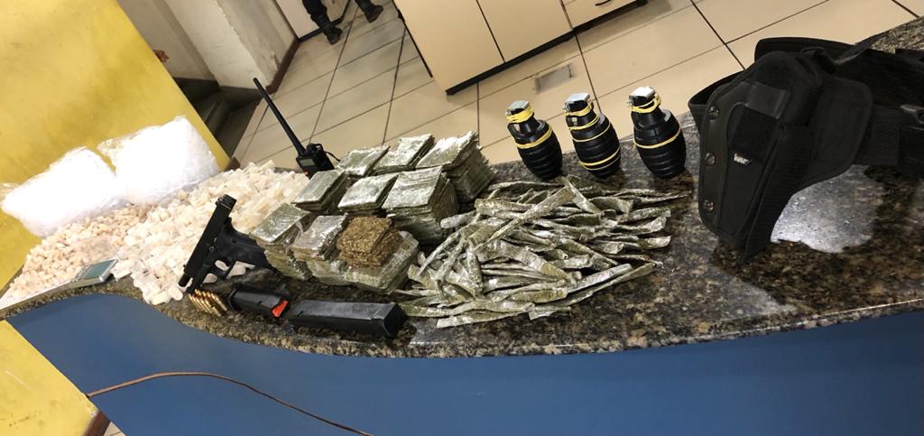 No local, também foram apreendidos 1.038 cápsulas de cocaína, 131 tabletes e 74 tiras de maconha, uma pistola 9mm, dois carregadores, três granadas, uma balança e um comunicador.