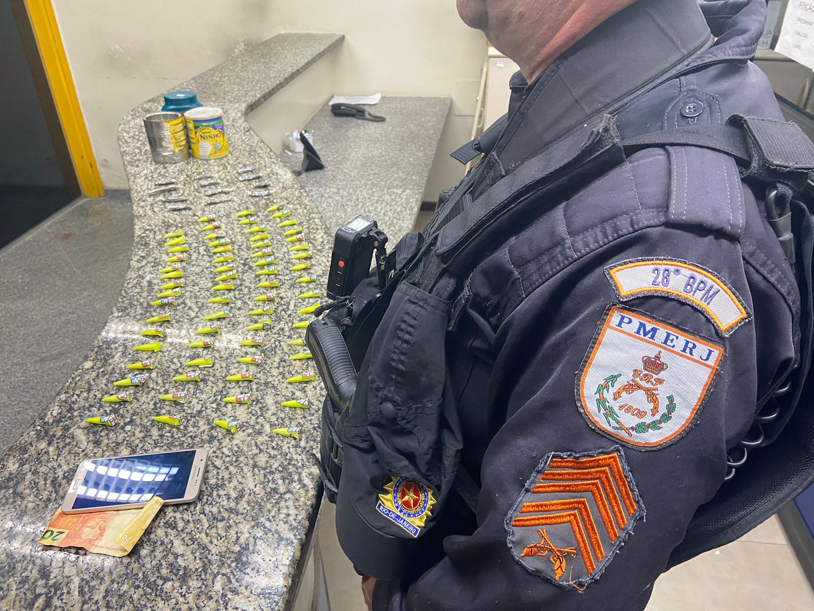 Chegando, os policiais encontraram o suspeito numa garagem fazendo a comercialização. Na primeira revista, foram encontrados quatro pinos de cocaína, três tiras de maconha, um celular e R$ 20.