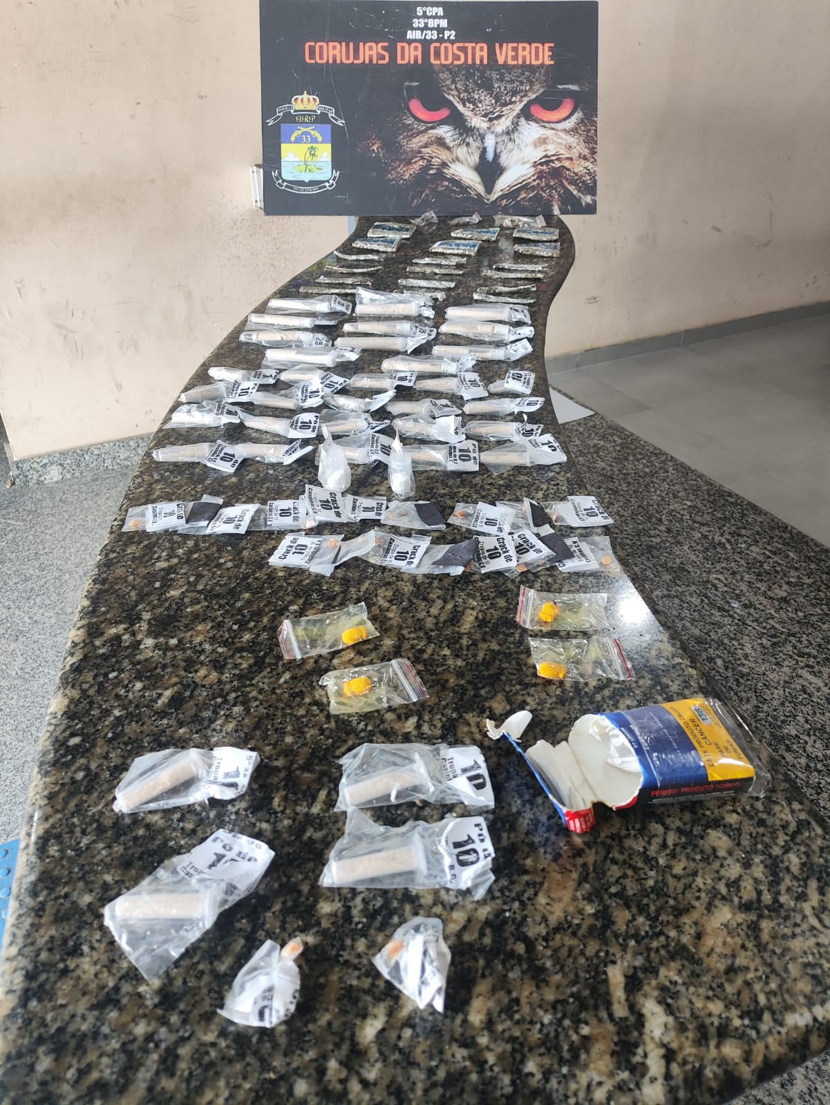 Policiais Militares do Serviço Reservado do 33º BPM, com informações encaminhadas pelo Disque Denúncia Angra (0300 253 1177), apreenderam neste sábado (25), 37 pinos de cocaína, 19 pedras de crack, 12 tiras de maconha, seis tabletes pequenos de maconha, quatro comprimidos de ecstasy e três sacolés de Skank, no Bracuí, em Angra dos Reis, na Costa Verde.