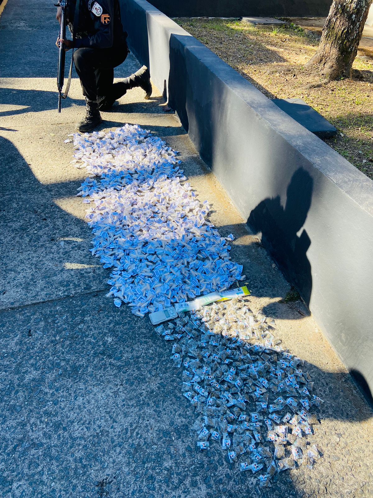Foram apreendidos 1.150 pinos de cocaína e 280 trouxinhas de maconha, além de material para embalagem da drogas. Os entorpecentes pertencia a facção criminosa do Comando Vermelho.