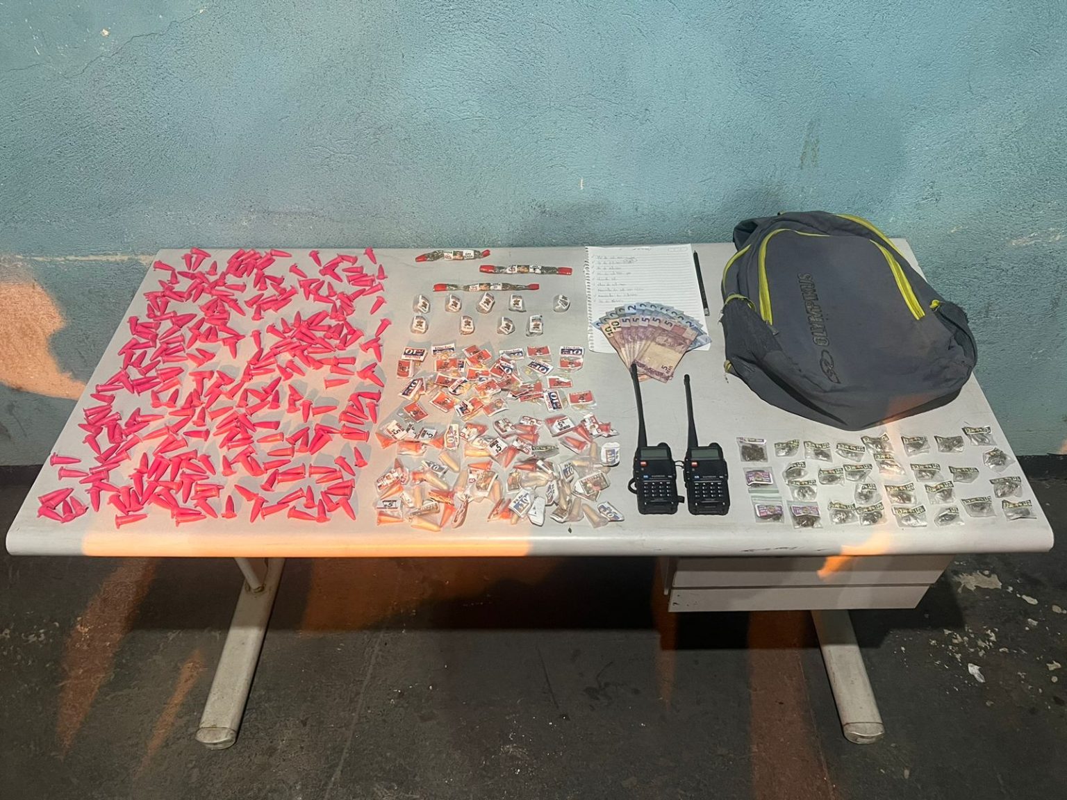 Chegando, os agentes encontraram o suspeito próximo a uma escadão com uma mochila. Ele foi abordado, revistado e, dentro dela, havia o material do tráfico. Foram apreendidos 304 pinos de cocaína, 50 pedras de crack e 30 pedaços de maconha, e outras três tiras da mesma droga, além de R$ 69 em espécie e um caderno de anotação.