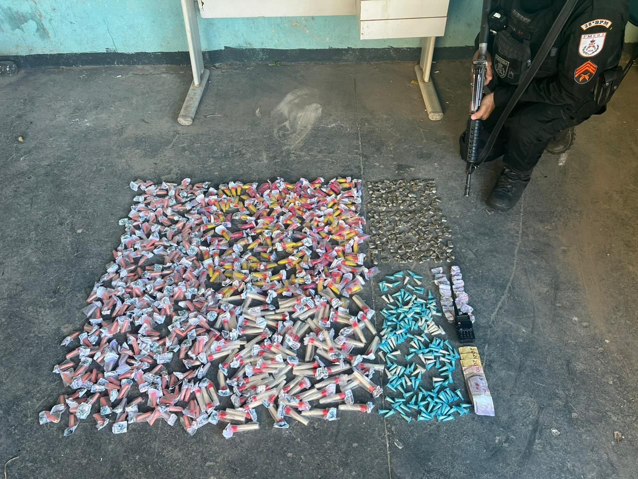 Chegando, os agentes chegaram ao local e avistaram o suspeito. Em revista, foram apreendidos 715 pinos de cocaína, 157 trouxinhas de maconha, 20 pedras de crack, um rádio de comunicação e R$ 100 em espécies.