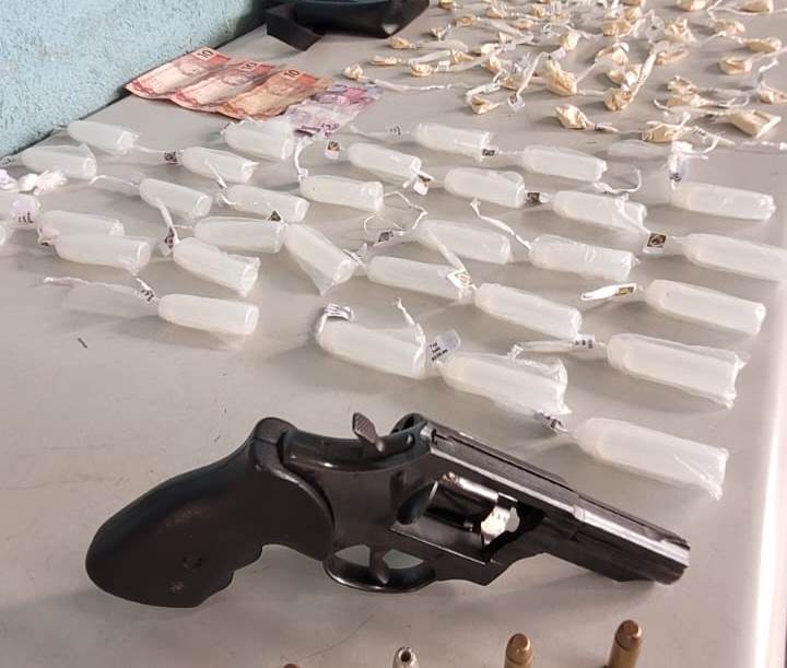 Chegando, os agentes encontraram o suspeito com um bolsa, nela, foram encontrados revólver calibre 38 com cinco munições, 53 sacolés de cocaína, 31 cheirinho de loló, dois rádios de comunicação e R$ 35.