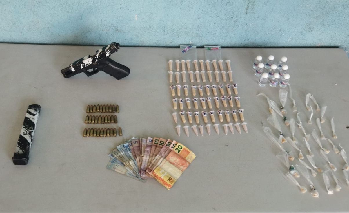 Chegando, os agentes fizeram a abordagem ao rapaz. Com ele, foram apreendidos uma pistola 9 mm com kit rajada e 31 munições. Além disso, foram apreendidos 60 pinos de cocaína, 31 pedras de crack, nove frasco de loló, além de R$ 104 em espécies.