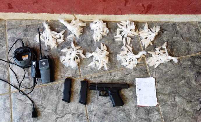 Ainda de acordo com a ocorrência policial, com o suspeito, foram apreendidos a arma de calibre ponto 40, com kit rajada, 24 munições do mesmo calibre, dois carregadores, 119 pinos de cocaína, além de um rádio transmissor e uma base para carregar rádio.