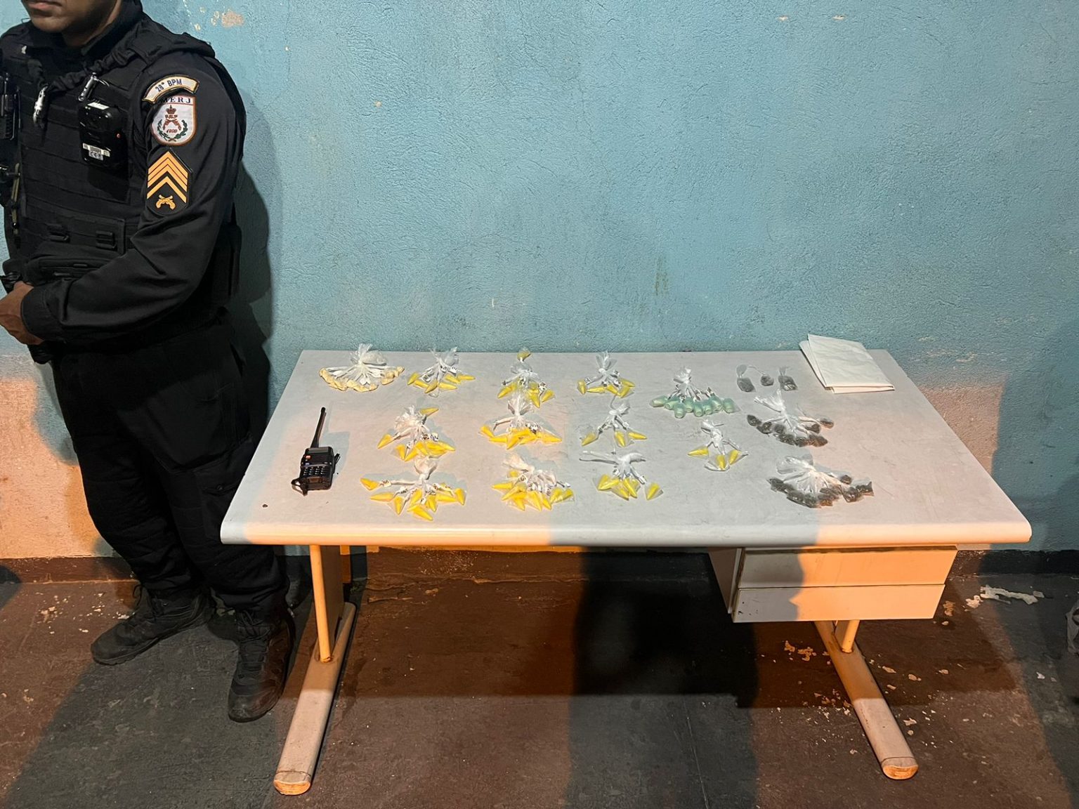 Chegando, os agentes confirmaram a informação e abordaram o suspeito. Na operação, foram apreendidas 93 cápsulas de cocaína e 21 trouxinhas de maconha, além de uma rádio de transmissão.