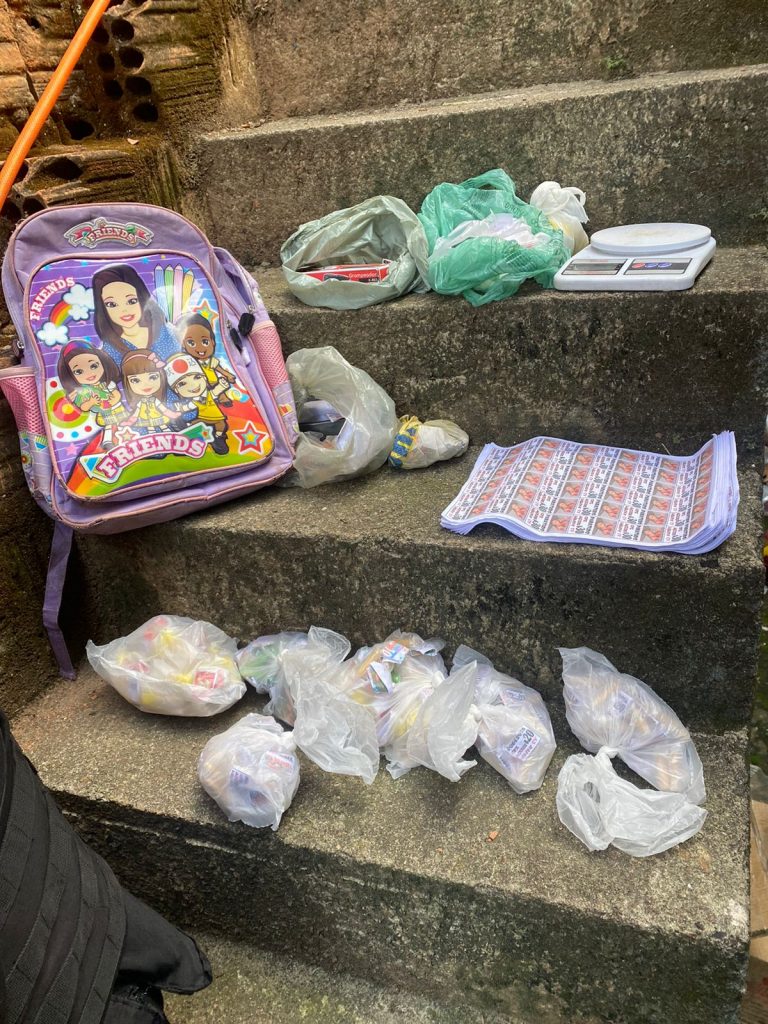 O traficante usava uma mochila infantil para esconder as drogas. Segundo a PM, ele foi flagrado tentando se desfazer de uma mochila contendo 198 pinos de cocaína, uma bola grande da mesma droga e uma balança de precisão.