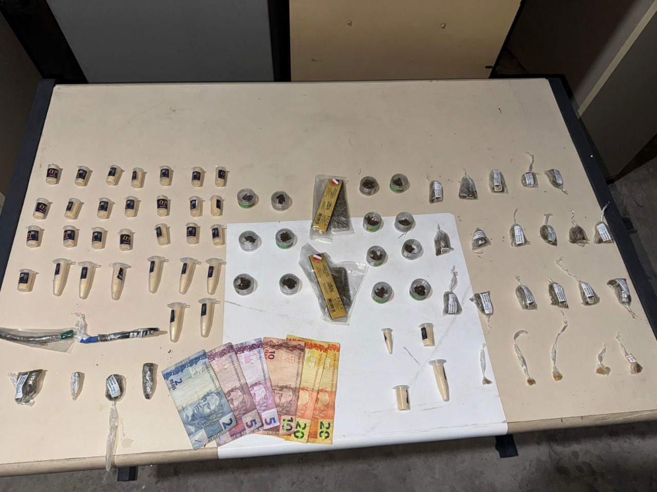 Com ele, foram apreendidos 33 pinos de cocaína, 24 trouxas de maconha, 14 sacolés de haxixe, cinco pedras de crack e R$ 62.