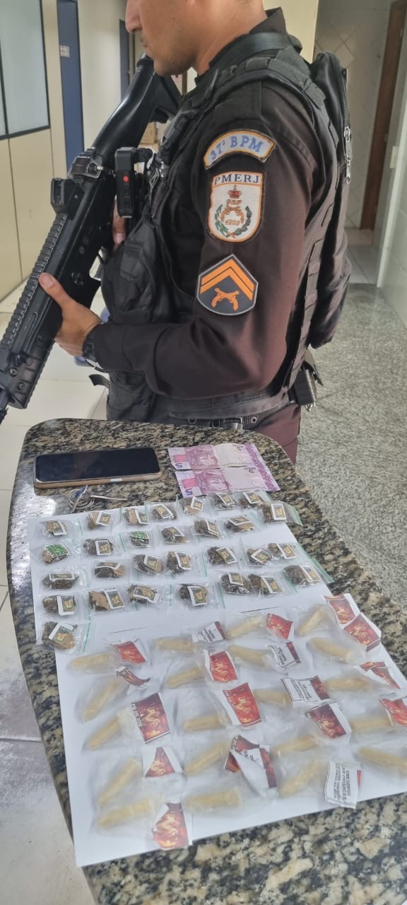 Após vasculhar a área, os militares encontraram um bolsa contendo 29 dolas de maconha e 20 pinos de cocaína. Foram apreendidos também um celular e R$ 10. Todo material e o suspeito foram levados para a delegacia de Resende, onde o caso foi registrado.