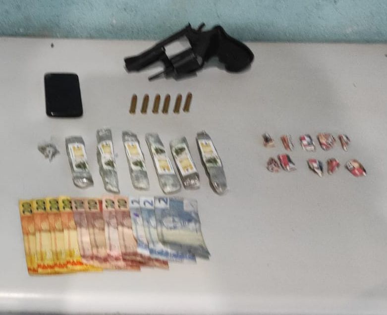 Um revólver, seis munições, um celular, seis pedaços de maconha no valor de R$50,00, 11 pinos de cocaína e R$ 126,00 em espécie.
