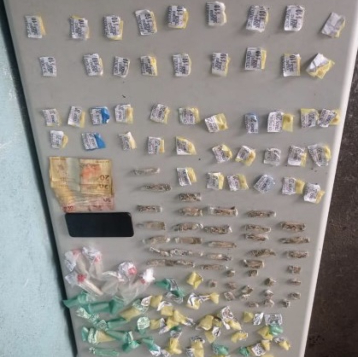 Chegando, os militares confirmaram a informação e, com ele, foram apreendidos 66 pedras de crack, 52 pinos de cocaína, 41 tiras de maconha, um celular e R$ 250.