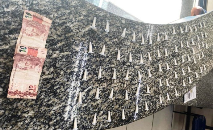 Com o suspeito foram apreendidos 73 pinos de cocaína e R$ 20. Ele foi levado à delegacia de polícia da cidade, onde o caso foi registrado.
