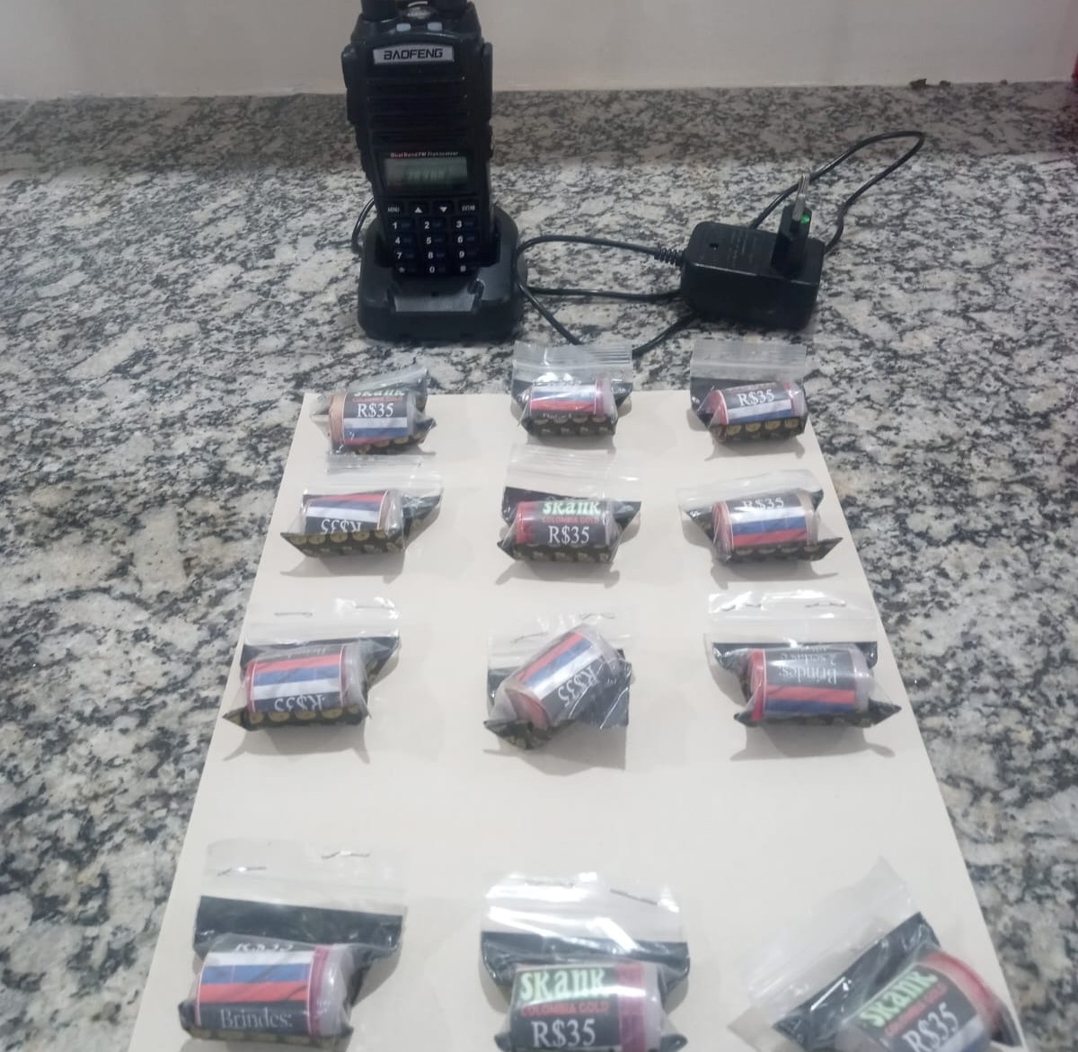 Antes de deixarem o condomínio, os policiais resolveram fazer uma busca na área externa. O material apreendido estava em poder de um homem que fugiu. Além do rádio, foram apreendidos 12 porções de skank.