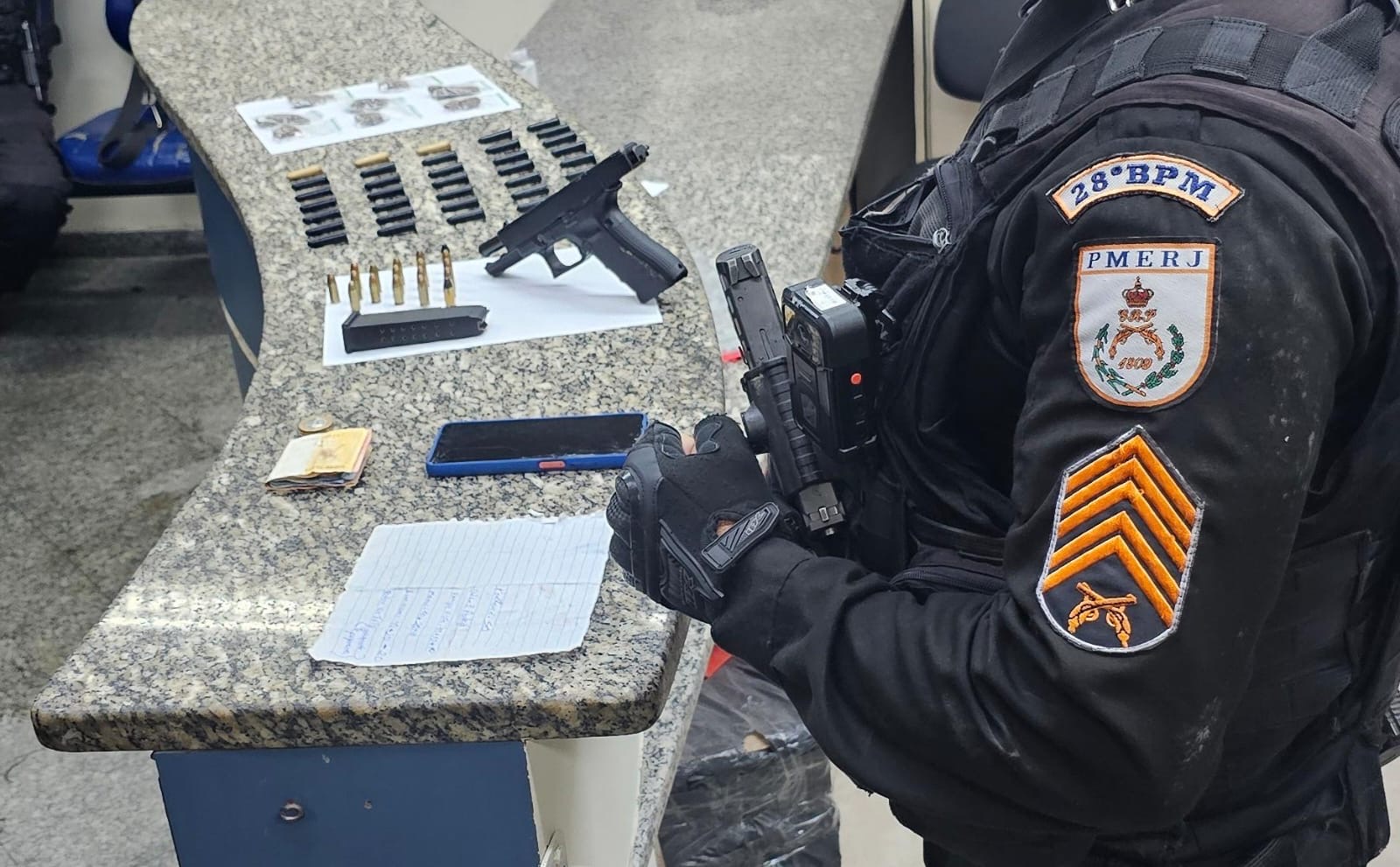 Com o marginal, foram encontradas uma pistola 9 mm com 18 munições, com kit rajada, um celular, oito embalagens de maconha, 36 pinos de cocaína, uma folha do tráfico e R$ 54.
