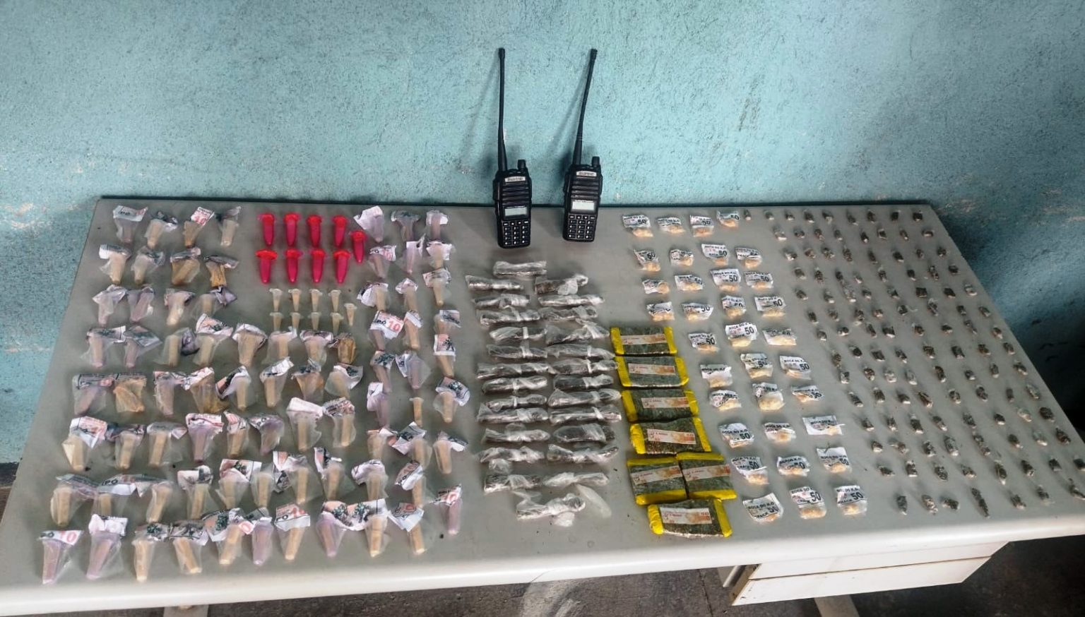 Em varredura pelo local, agentes encontraram 34 pedras de crack, 96 pinos de cocaína, seis pequenos tabletes e 235 trouxinhas de maconha, além de dois rádios de comunicação. Os produtos apreendidos foram apresentados na delegacia de Volta Redonda. (Foto: Polícia Militar)