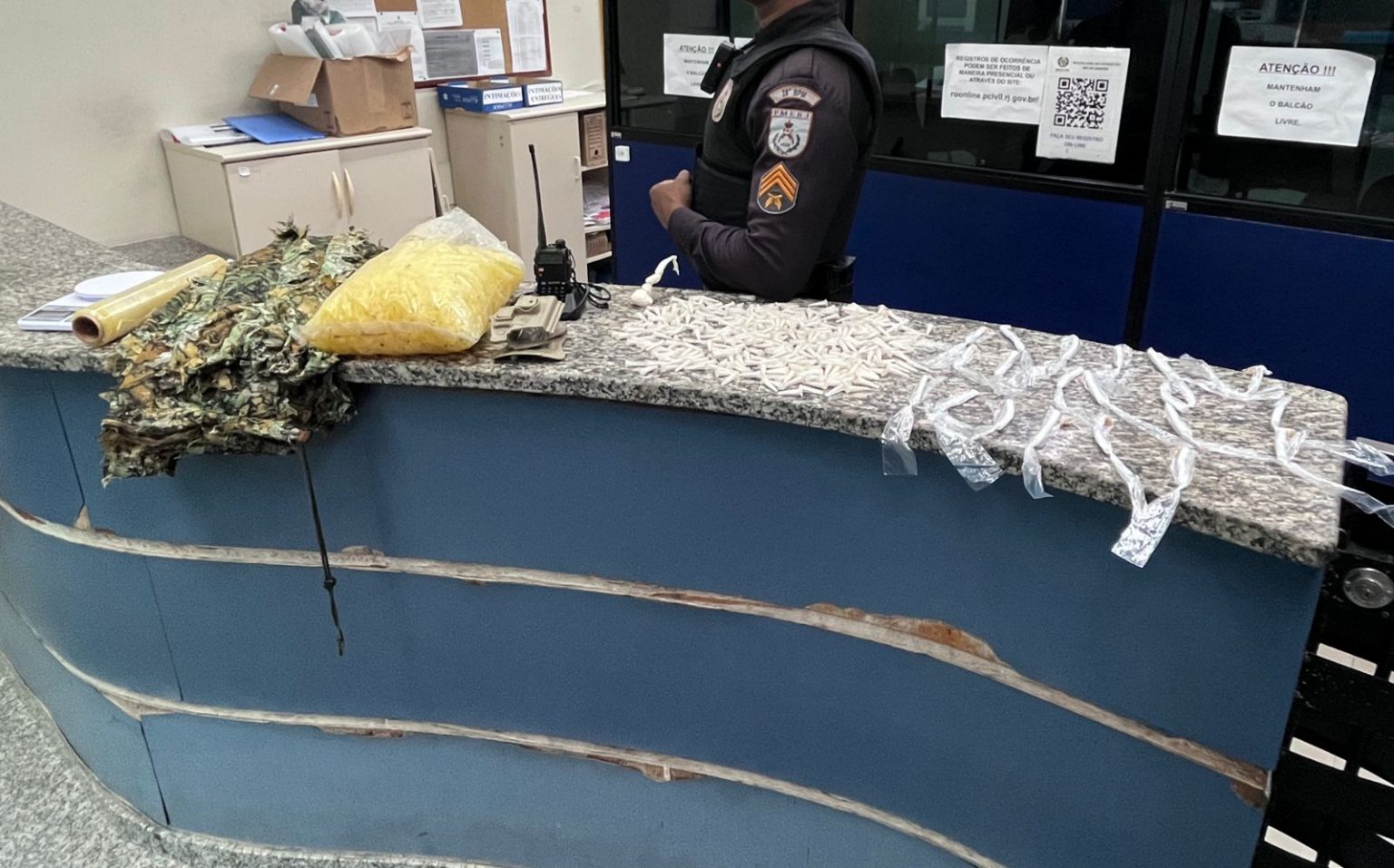 E ainda: foram apreendidas uma roupa camuflada, uma balança de precisão e rolo de plástico para embalagem das drogas. Os policiais chegaram a fazer buscas, mas ninguém foi encontrado. O material e as drogas foram levados para delegacia de Barra Mansa (90º DP), onde o caso foi registrado.